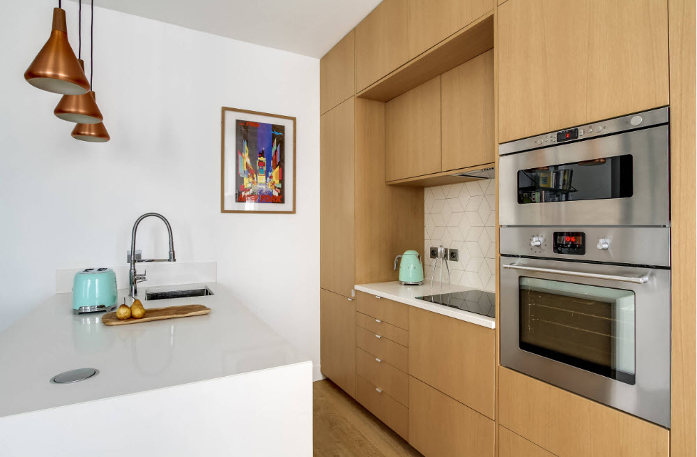 مثل هذا التصميم سيكون حلاً جيدًا للمطبخ المستطيل الضيق ، خاصةً إذا كانت النافذة موجودة على الحائط النهائي ، وتقع منطقة تناول الطعام في غرفة المعيشة. في هذه الحالة ، يمكن وضع الأثاث بشكل مريح قدر الإمكان ، مما يجعل المطبخ "مثلث" متساوي الأضلاع.