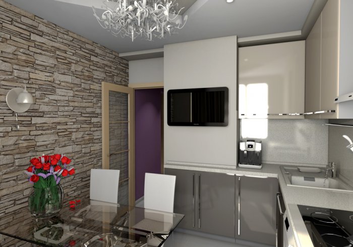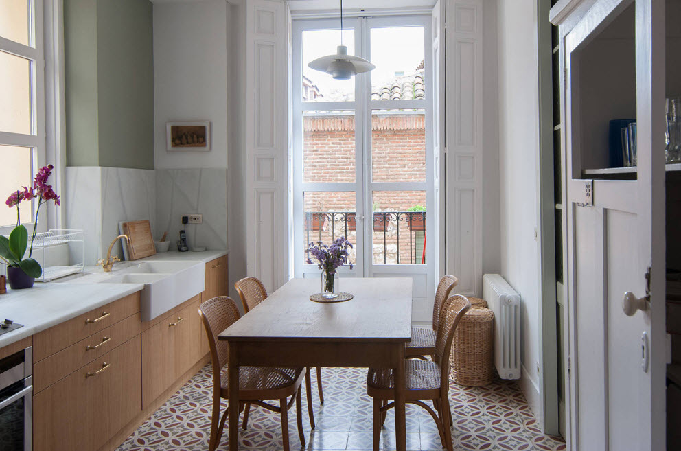 - سيظهر تأثير جيد إذا اخترت مواد مماثلة لتزيين المطبخ وجدار الشرفة. وبالتالي فإن المساحات تبدو أكبر ، سيتم إضافة الوحدة.
