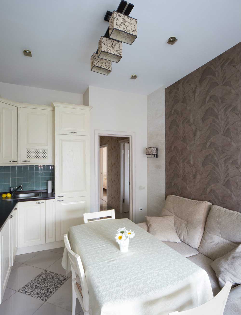 في الغرفة ذات الشكل المربع ، يمكن وضع أريكة صغيرة على الحائط المقابل لمجموعة المطبخ