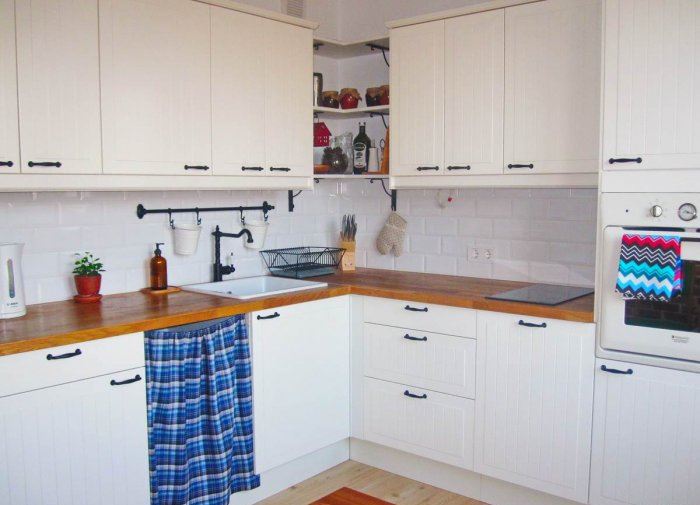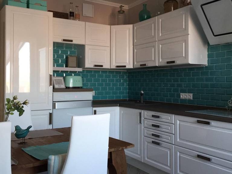 - يجب أن تفي المواد المحددة بعدد من المتطلبات: أن تكون مقاومة للرطوبة ، ومقاومة للحرارة ، وأن تكون مقاومة لأشعة الشمس ، وأيضاً مقاومة لعناصر التنظيف ، لأن المطبخ ، كما تعلم ، يتطلب تنظيفًا مبللًا أكثر تكرارًا من الغرف الأخرى في الشقة.