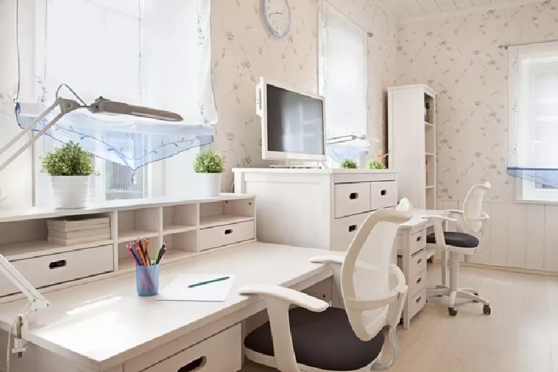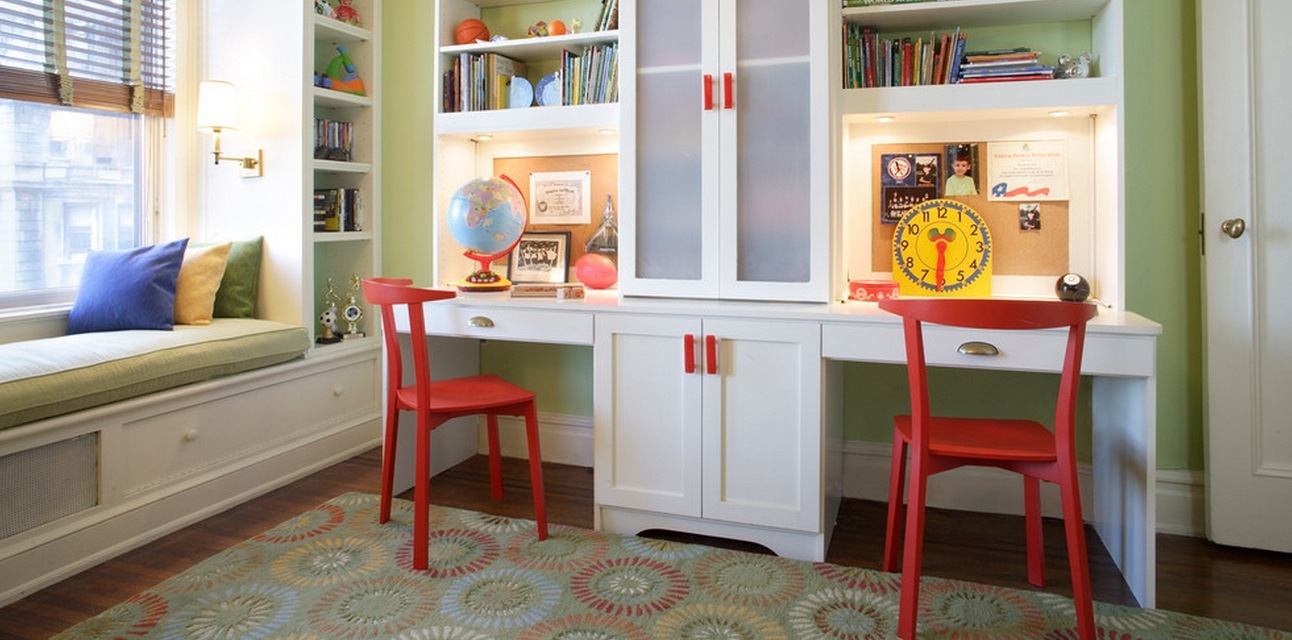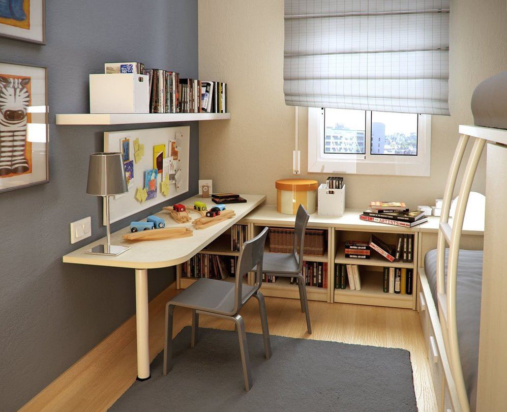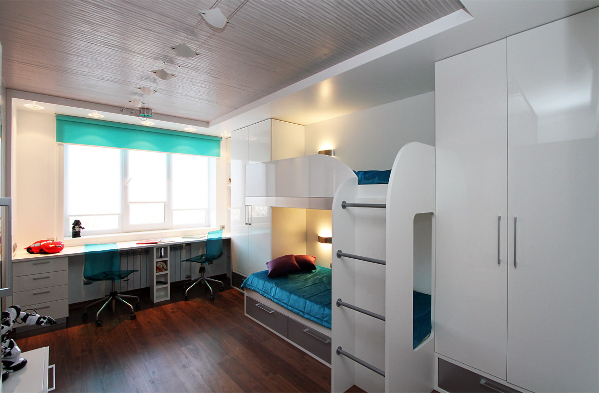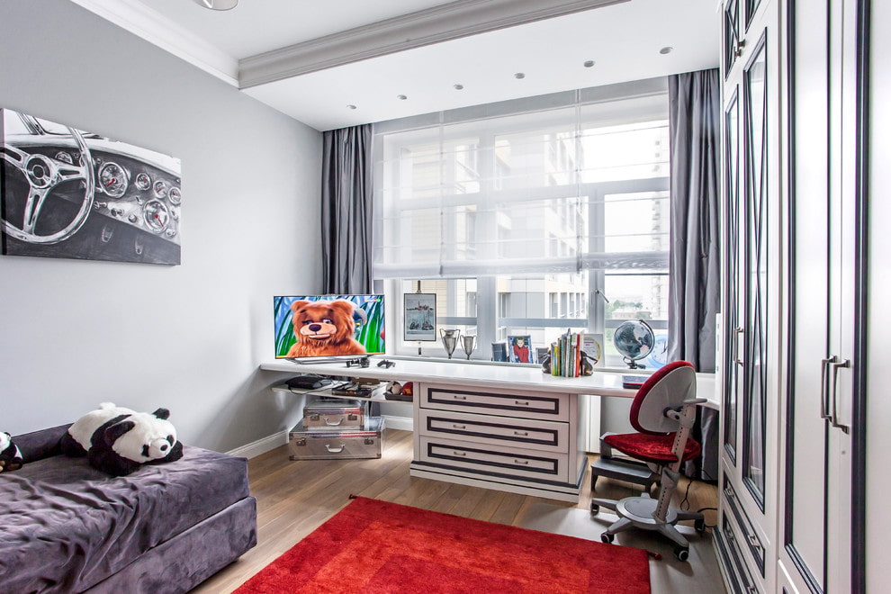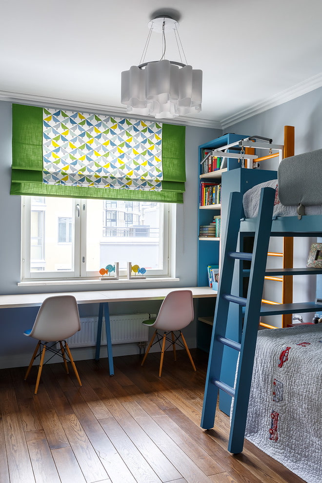 Стилен дизайн на стаята за момчета-ученици. Дълъг плот с вградени чекмеджета е поставен близо до прозореца, всяко дете има собствена работна зона