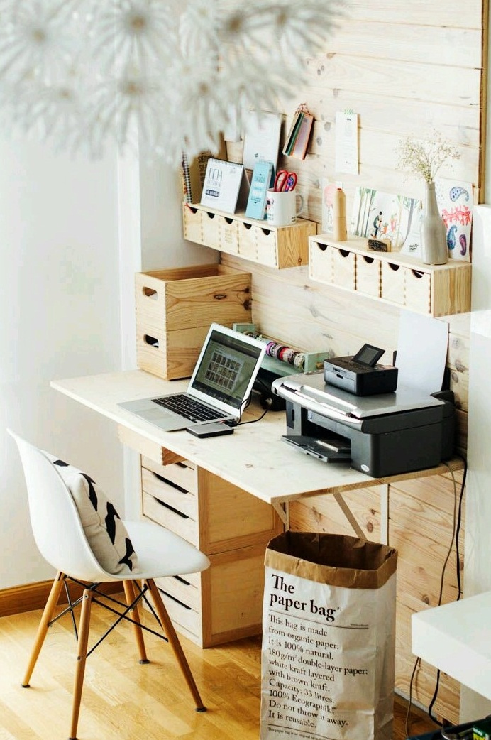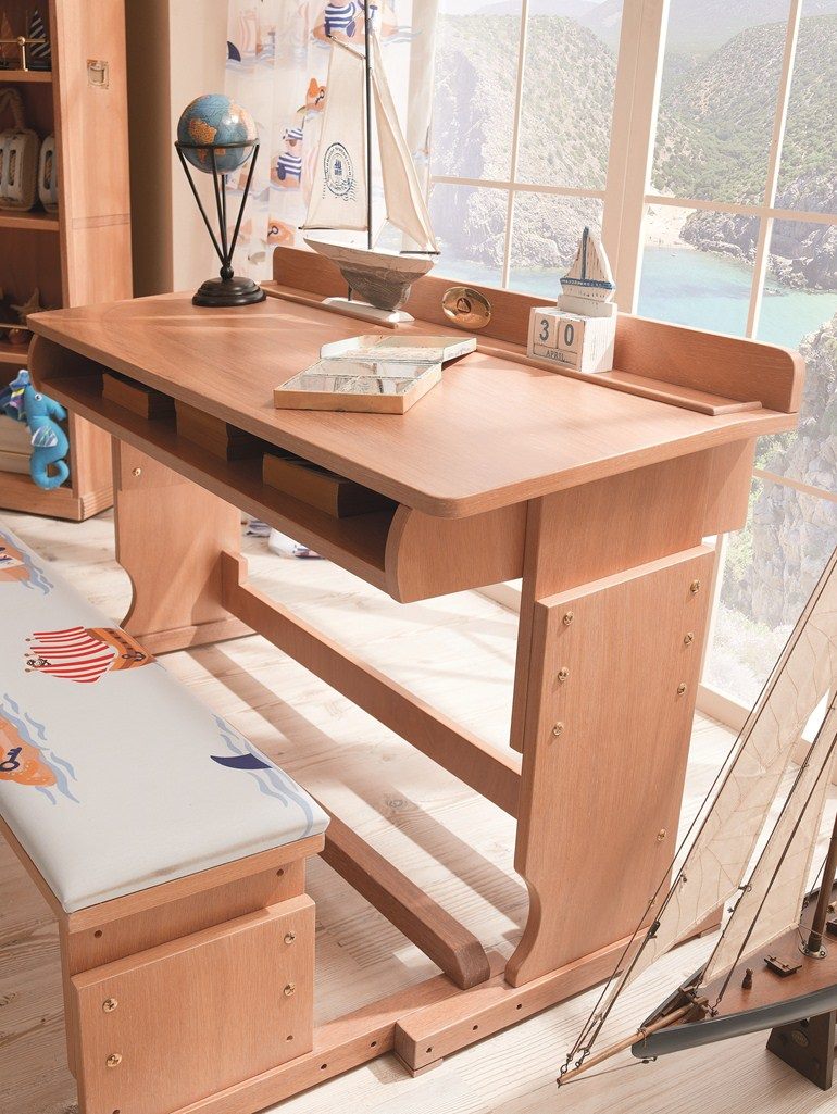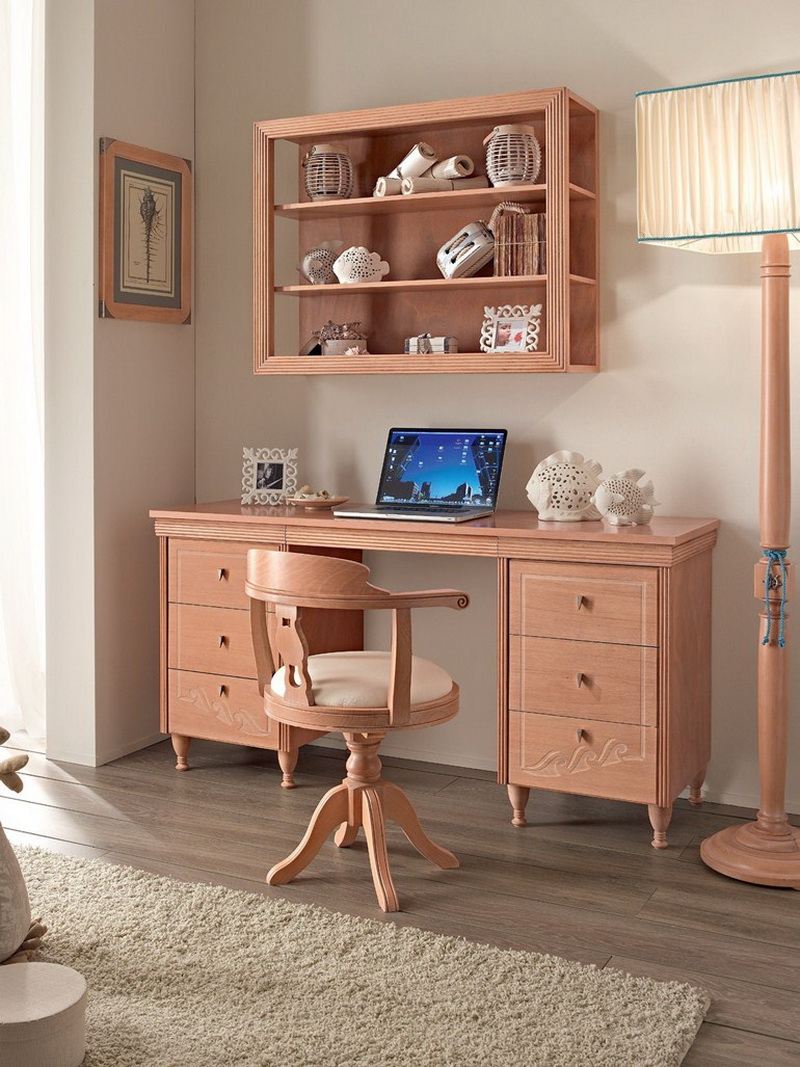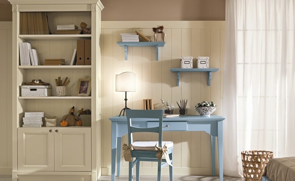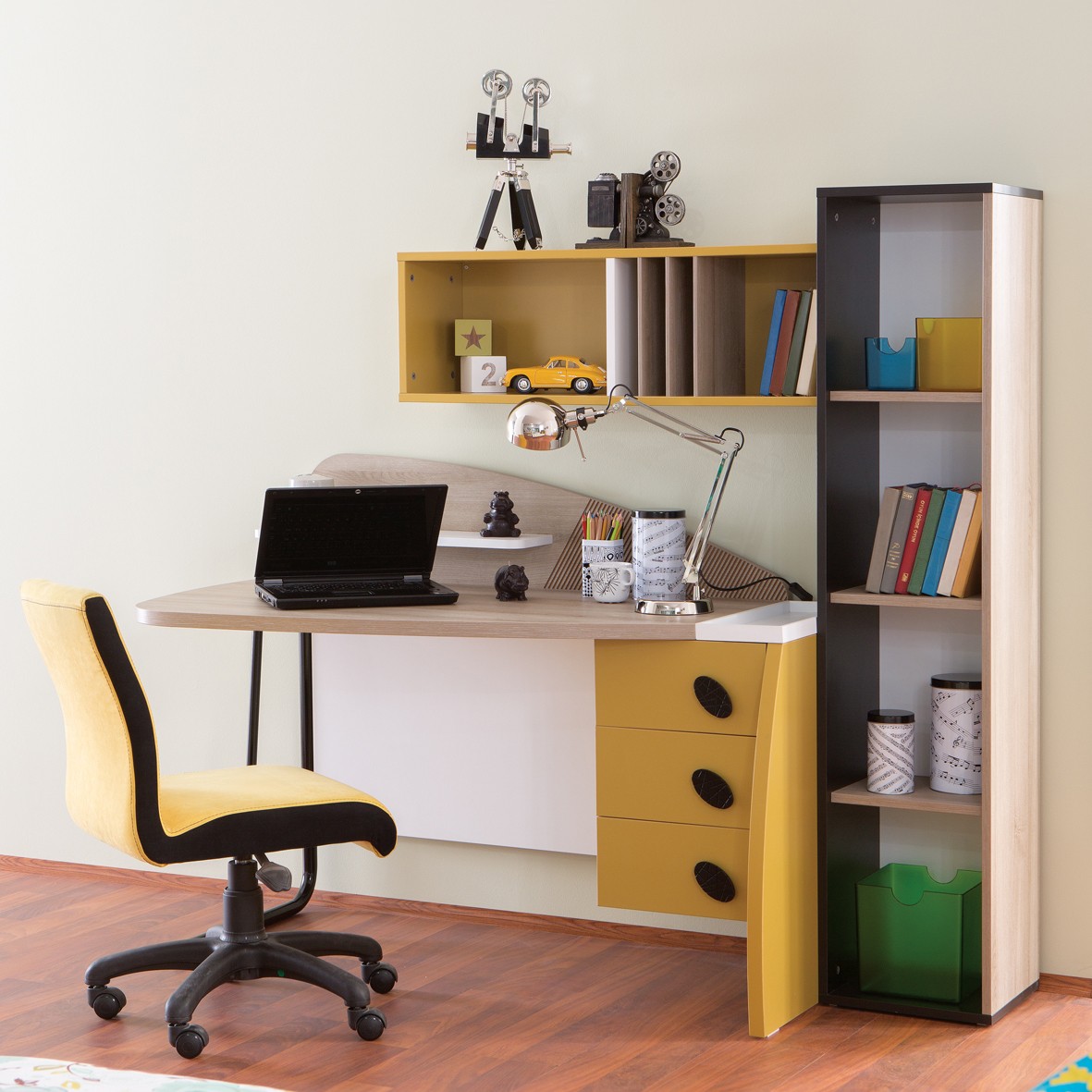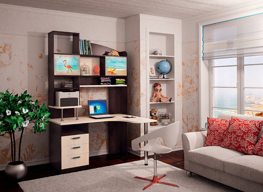 - Писане. Класически голям плот, под който има шкафове с чекмеджета от едната страна и отворени рафтове за учебници от другата. Често такива модели се допълват от висящи рафтове за монтаж на стена и стационарно осветление.
