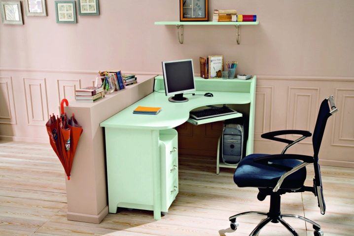 - Corner. Най-добрият избор за малка стая. Избирайки ъглова маса в детската стая, можете да спестите използваемо пространство и да организирате много удобно място за обучение за детето. Широката гама от продукти ще ви позволи да изберете ъглов модел, пригоден за инсталиране на компютър.Обърнете внимание на моделите с L-образна форма, които имат голяма площ на плота, където спокойно могат да се настанят две деца.