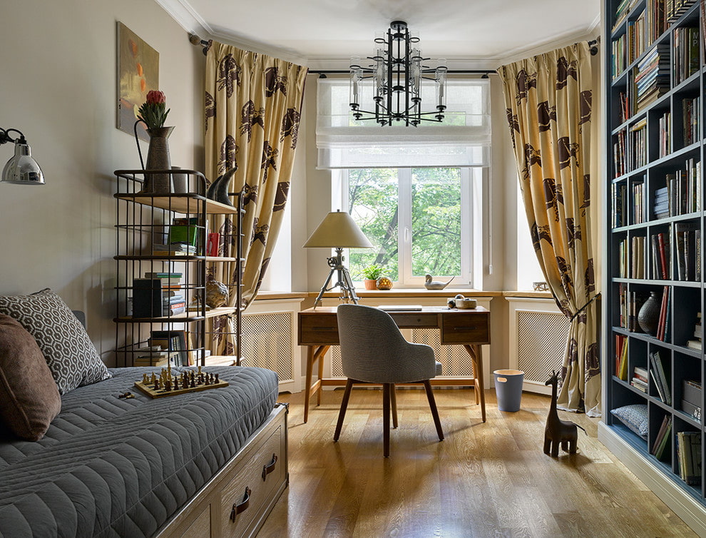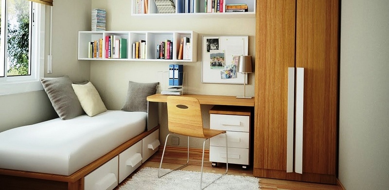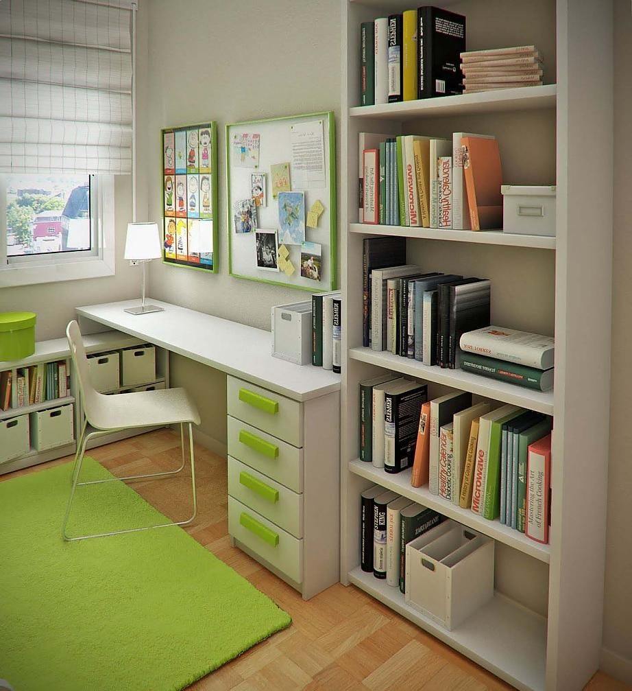 Маса в цялата стена на стаята, допълнена от шкаф за съхранение на книги и канцеларски материали