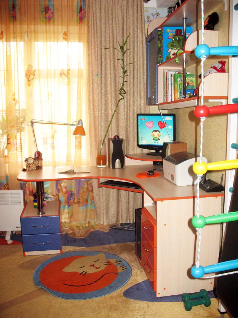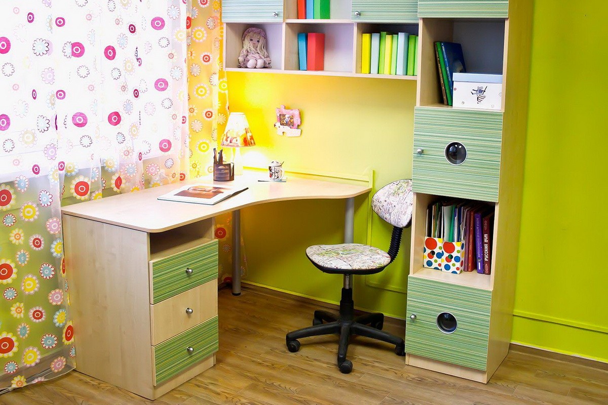 Изборът на цвят зависи от предпочитанията на детето и цялостния стил в дизайна. Основното е, че те трябва да бъдат светли нюанси, тъмен цвят по време на часовете може да повлияе неблагоприятно на очите на децата. По-добре е също да откажете ярки цветове, това може да повлияе негативно на психиката и да има вълнуваща реакция. Най-добрият избор е цветът на естественото дърво, който е подходящ за всеки дизайн в стаята.