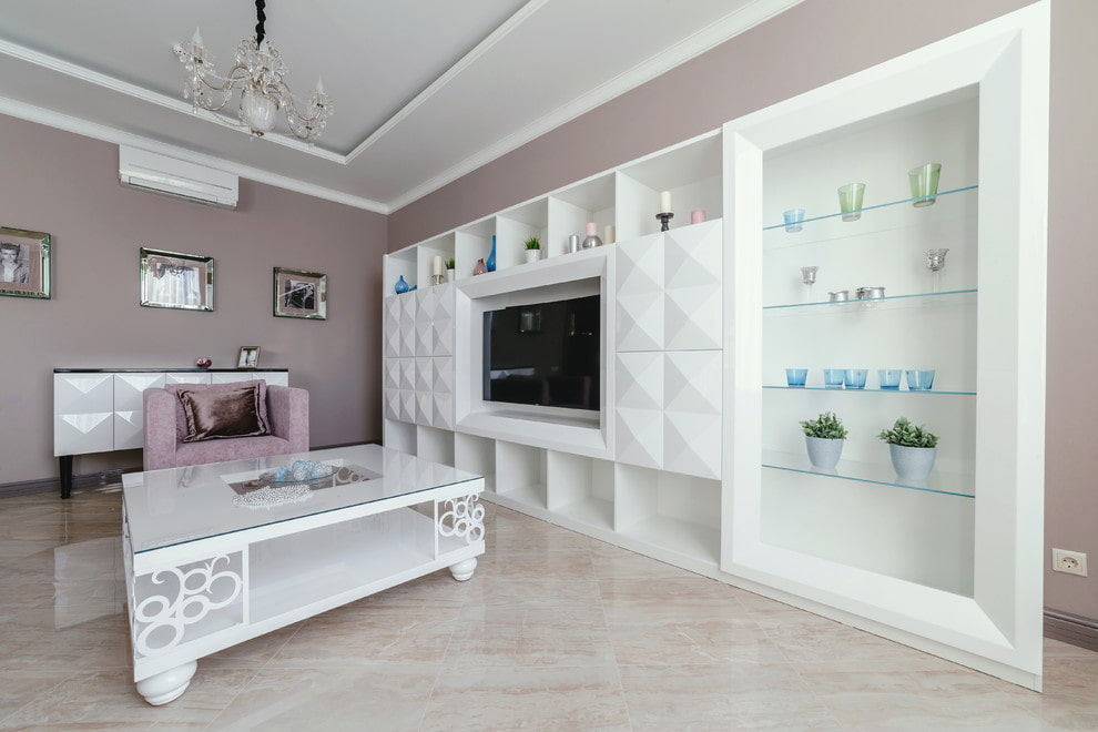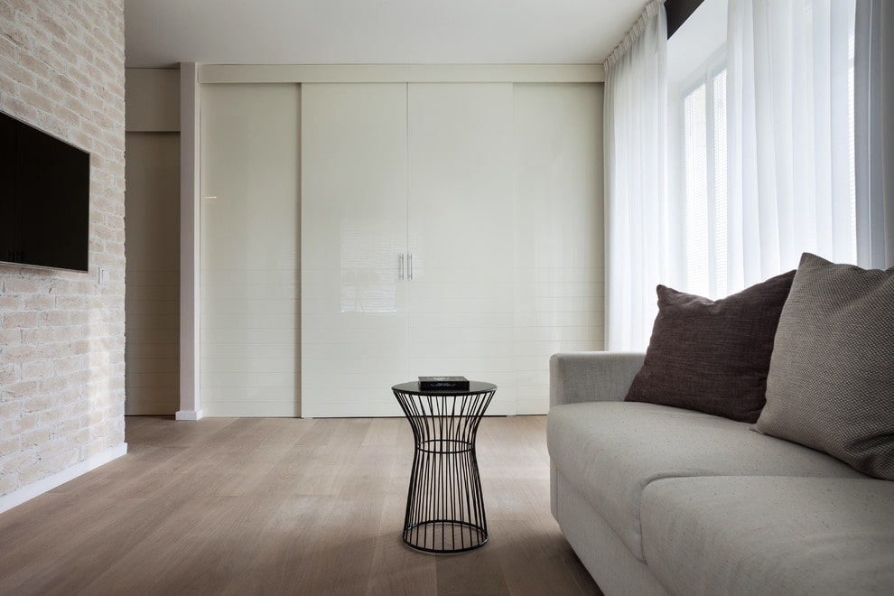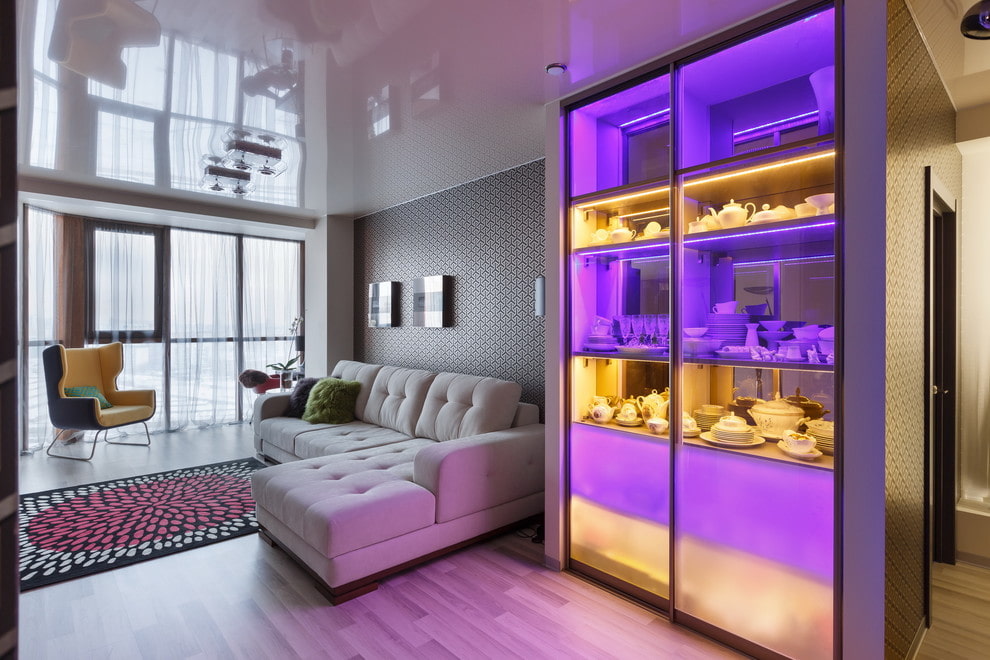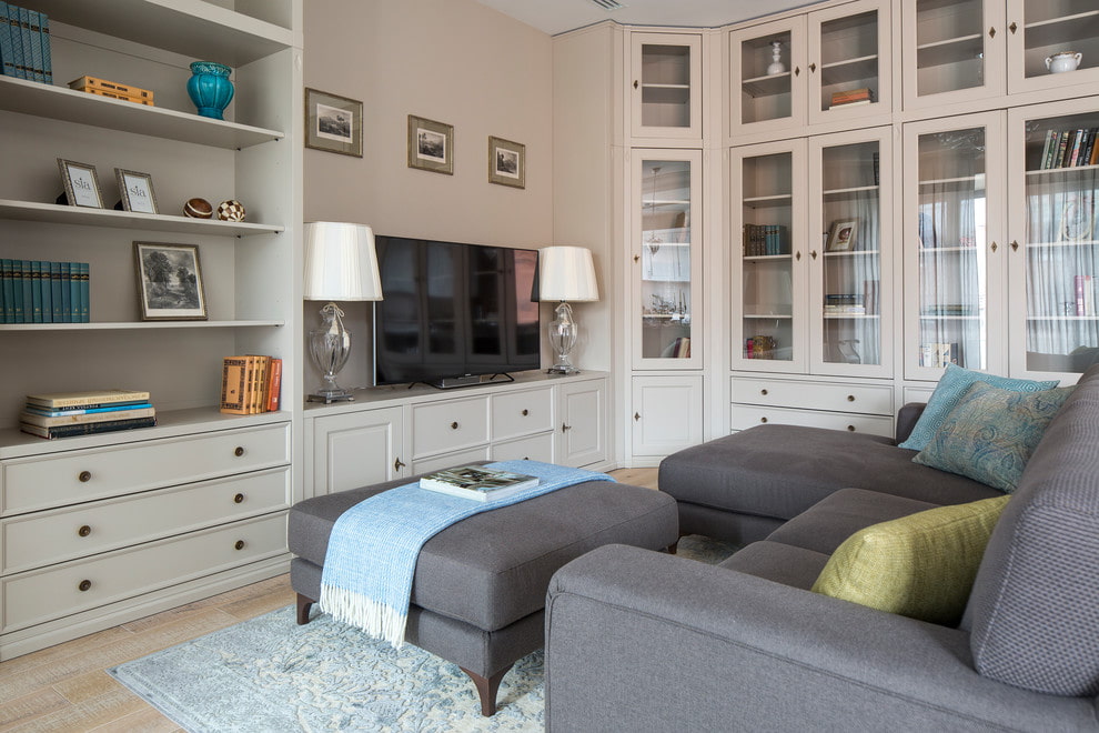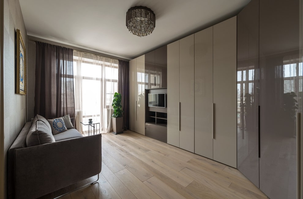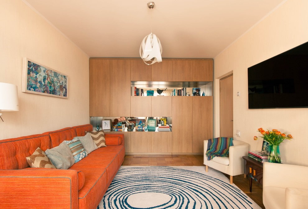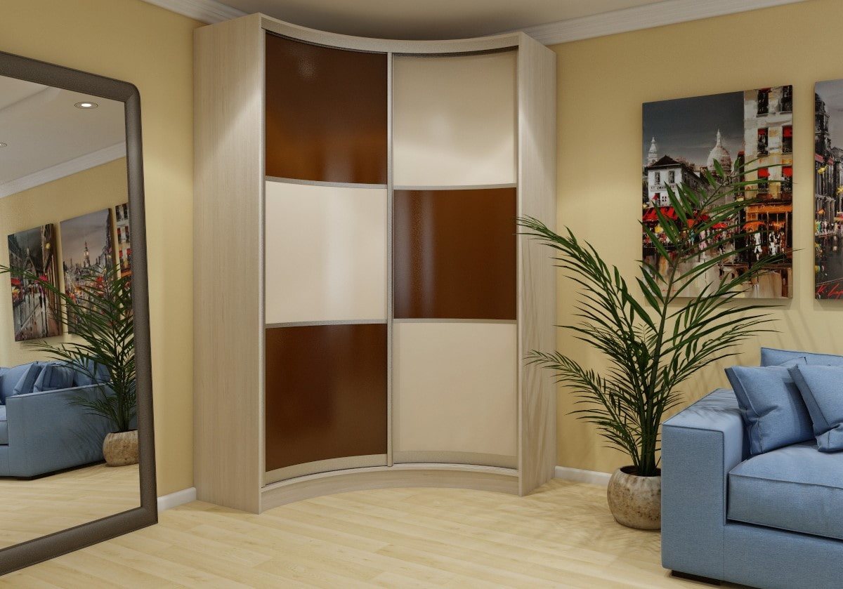 Радиусният шкаф също не е подходящ за малка всекидневна, защото Това е скъп дизайн и не се вписва със стил в малка стая.