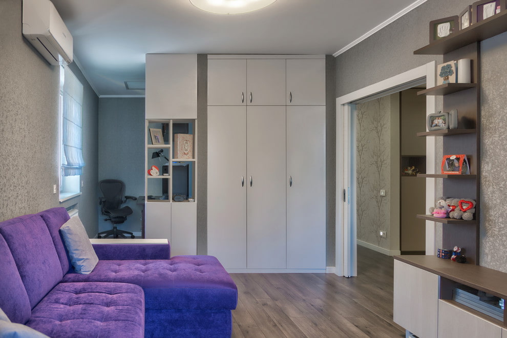 - Директно: разположен по протежение на стената или напречно, перфектно такъв шкаф в стаята може да се види на снимката
