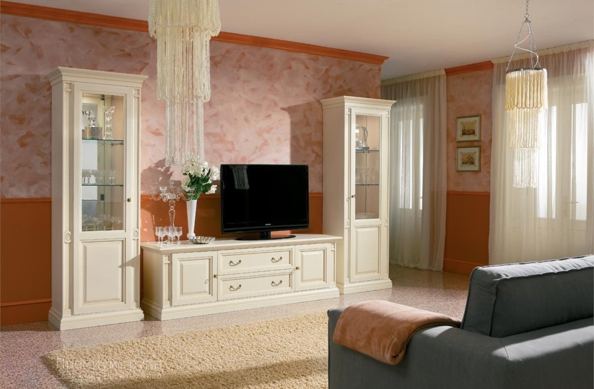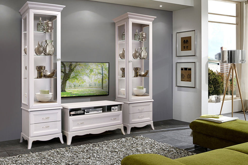 Класическият вид на интериора е завършен без шкафове. Основните разлики от другите интериори: простота, обикновена декорация, естествена текстура, красиви витражи, големи размери, висока цена на външен вид, нюанси на дърво и др. Такива шкафове за залата в апартамента можете да разгледате по-долу.