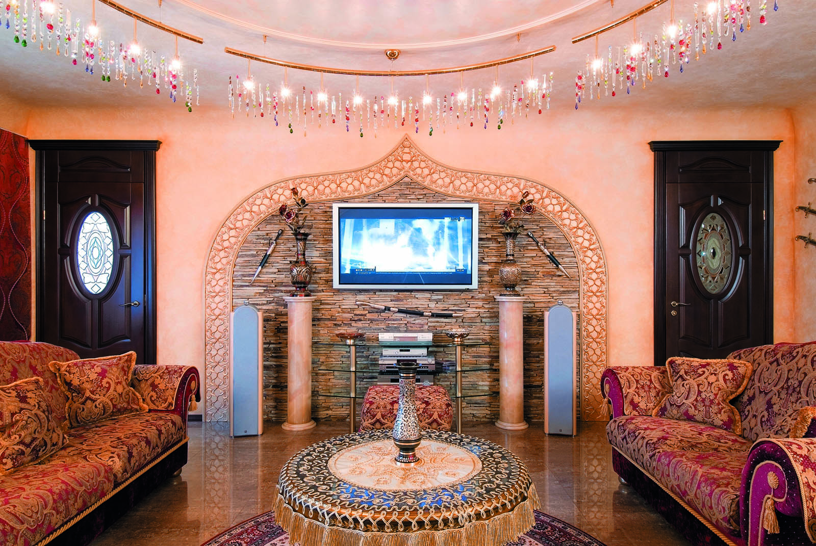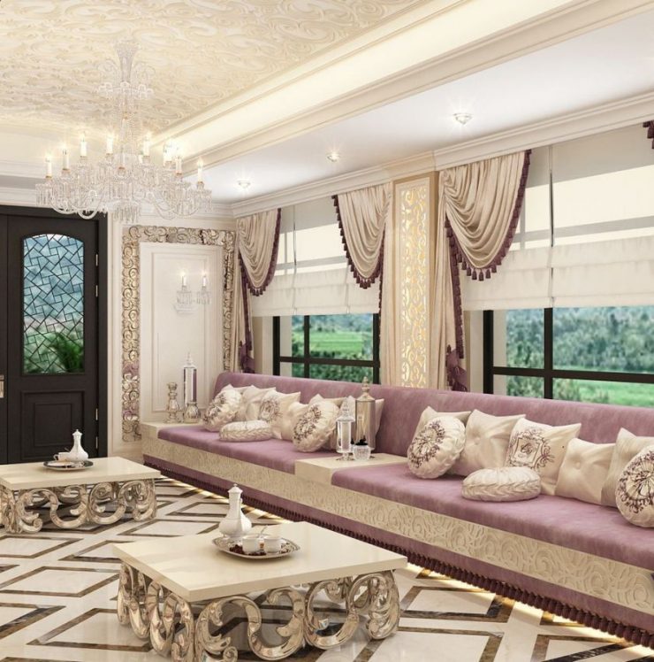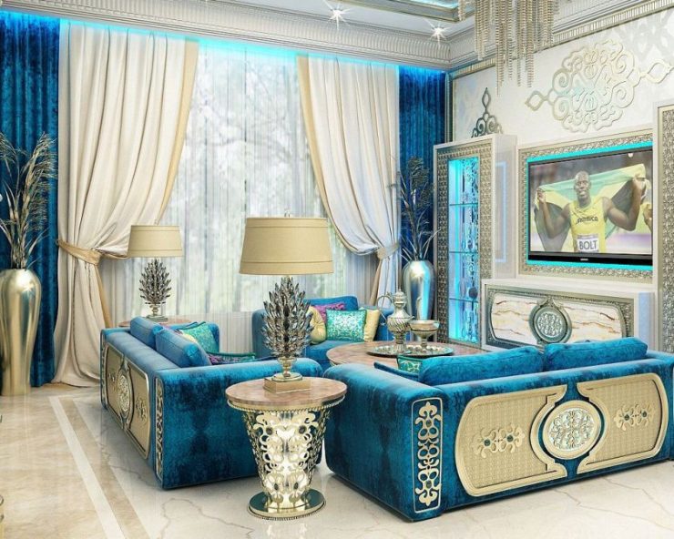 Обърнете внимание! Най-често арабският стил в дизайна има тюркоазено, лилаво и жълто в различни нюанси.