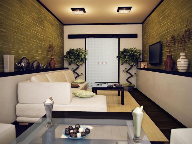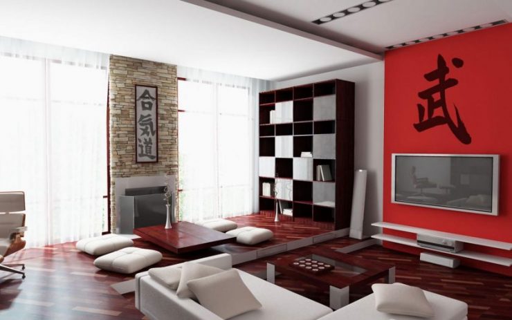 - сред елементите на декора се избират вентилатори, азиатски орнаменти под формата на сакура, планински мотиви или водни потоци, както и характерни керамични изделия с подходяща картина;