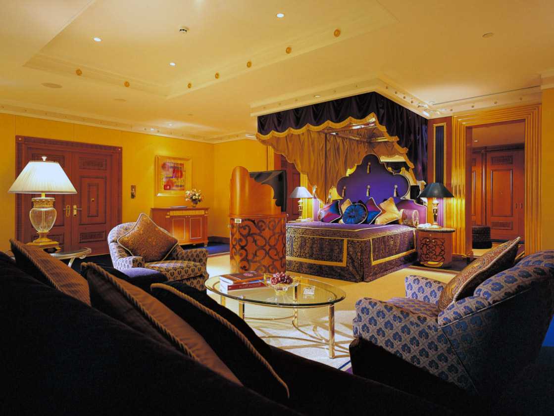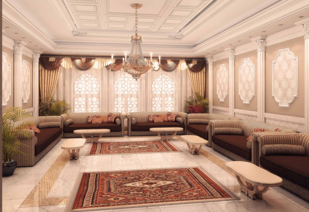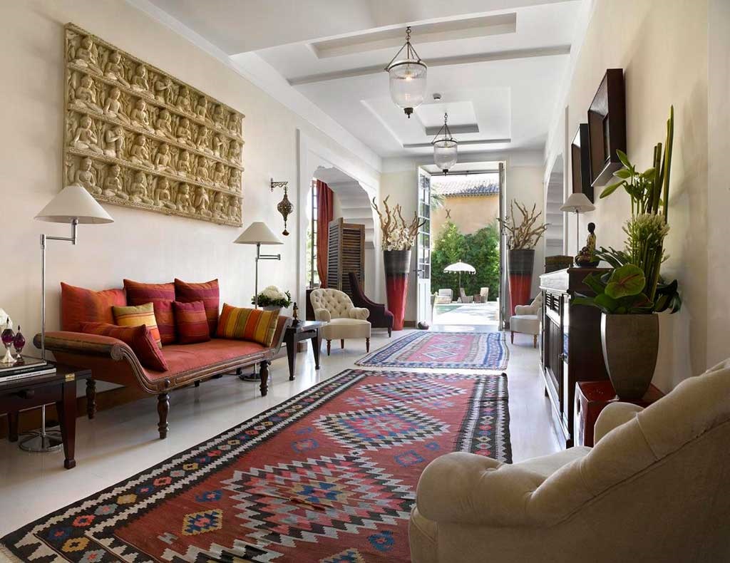Многоцветни дивани, стъклена маса, ярки килими добавят разкош.