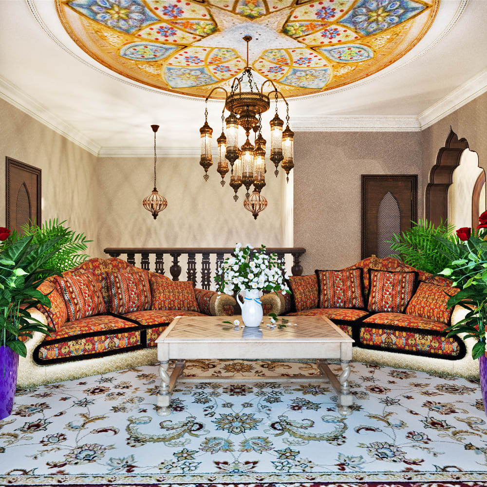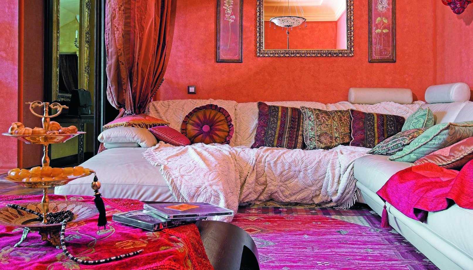 - меки ниски дивани с проста форма, но изпъстрени с пъстри възглавници с арабски орнаменти;
