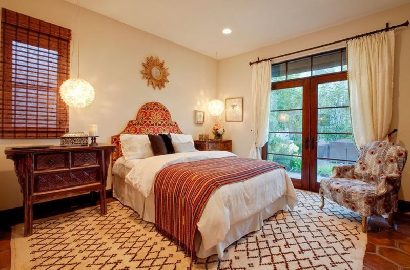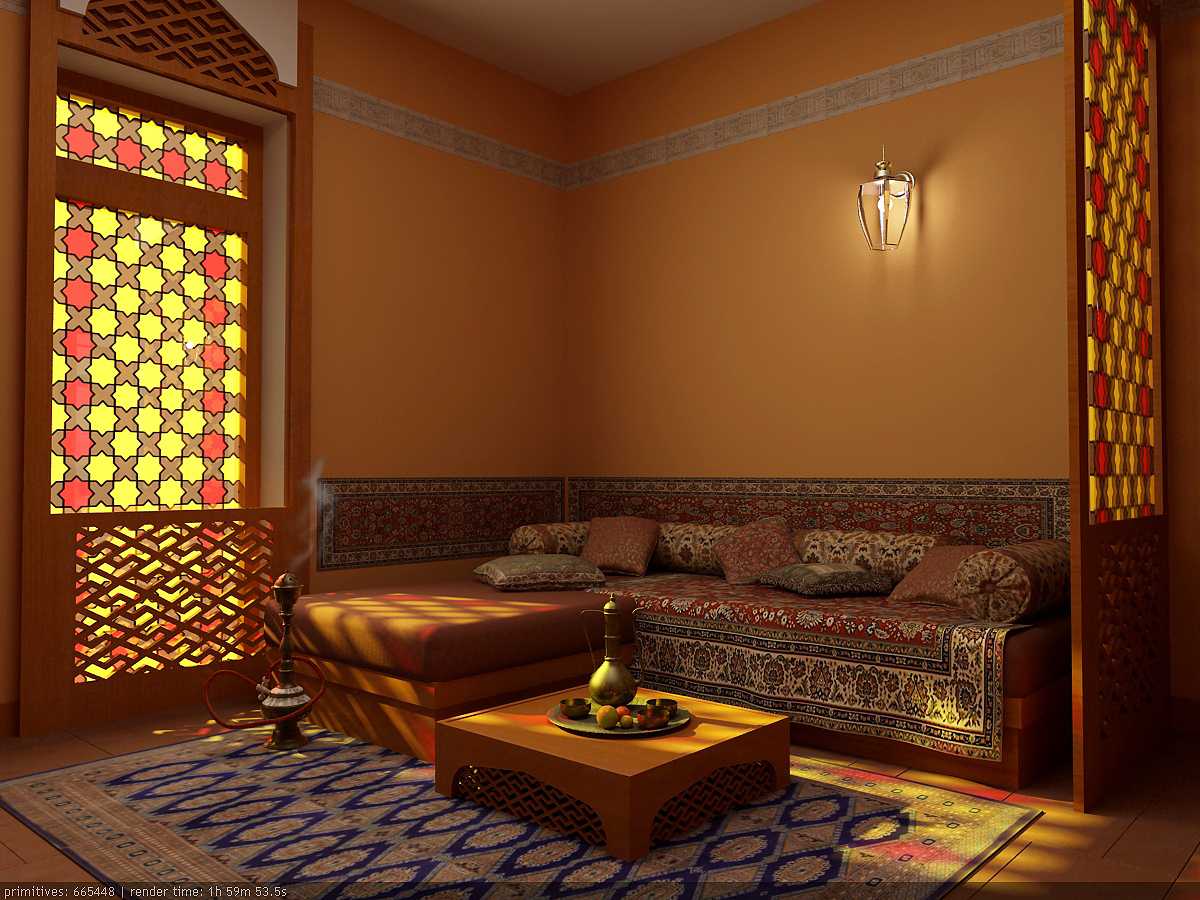 Арабските мебели трябва да са компактни, но богати на дизайн. Диванът може да бъде тапициран с ватиран плат с орнамент. Сенник с пискюли е разположен над леглото в спалнята.
