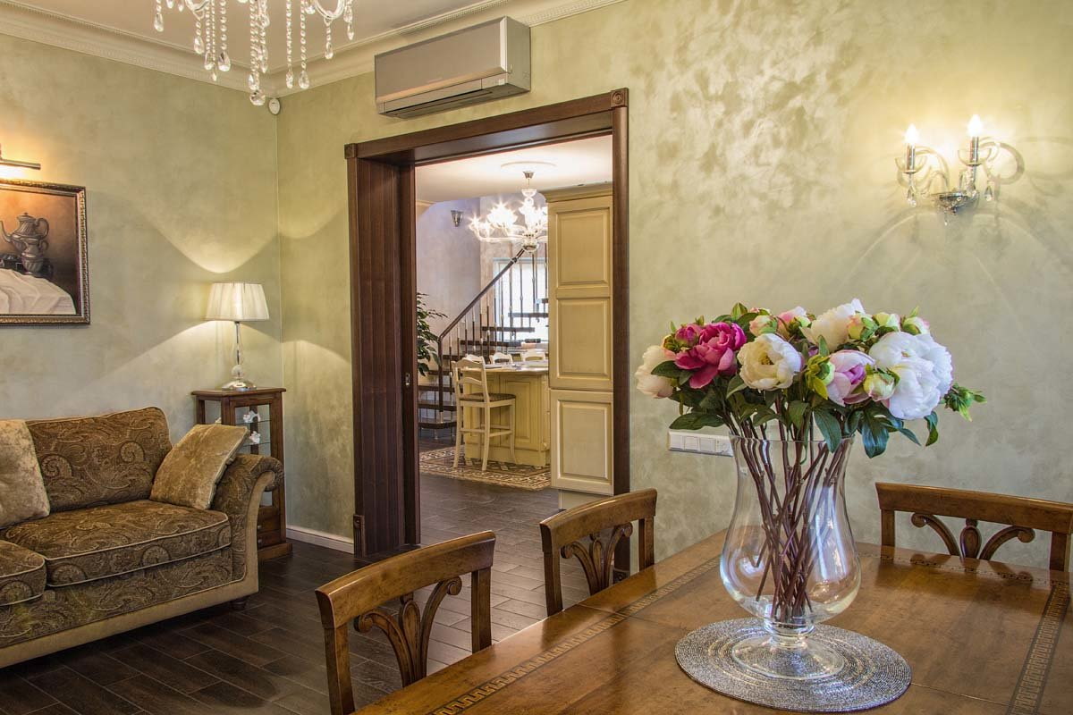Тази гледка в интериора на апартамента изглежда най-красива от другите композиции. Сместа може да се нанася както на вертикални, така и на хоризонтални повърхности, често колоните се обработват с такава мазилка, за да се създаде готически стил в интериора. С помощта на венецианците се създава благородна текстура от мрамор с уникални петна и лъскава повърхност, което се постига с помощта на восък. Чрез добавяне на оцветяващи пигменти към състава може да се постигне всеки цвят на повърхността или естествен нюанс на камъка.