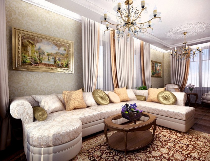 За да привлечете пари в интериора на апартамента, се препоръчва да използвате следните цветове: злато, лилаво, лилаво, зелено, тъмносиньо, черно. Изброените цветове ще придадат на интериора на хола шик и представяне. Може да се използва в мебели, материали за декорация, текстил, както и декоративни елементи.