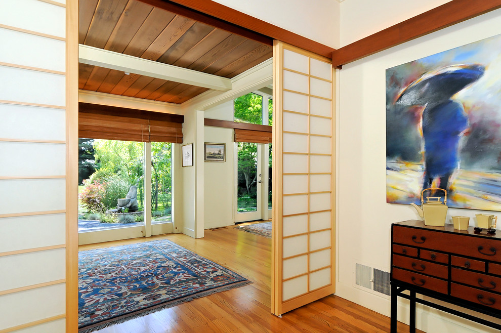 Ако стаята е малка и няма къде да поставите цветя, можете да украсите стените с картини, снимки или рисунки с изображения на пейзажи или отделни елементи, например, клонка от цъфтяща сакура. Изящните и удобни мебели от ракита от ратан ще изглеждат много модерни и стилни.