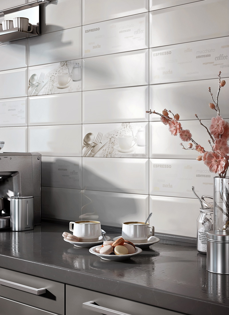 - Surface. Тя може да бъде абсолютно всичко: лъскава, матова, релефна. Всяка опция има своите плюсове и минуси: Лъскавото покритие изглежда красиво и създава усещане за чистота при редовна правилна грижа. Но трябва да сте подготвени за факта, че всяка капка се вижда на такава повърхност. На матовата повърхност капки и пръски не са толкова забележими, но с течение на времето порестата повърхност се запушва с прах и капки мазнини, поради което изисква по-щателно почистване. Релефната повърхност на плочки изглежда много впечатляваща, но не практична, тъй като бързо се замърсява.