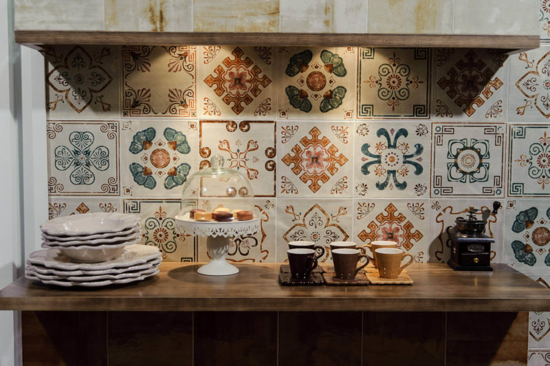 Плочки с рисунки на цветя могат да бъдат избрани както за селски интериор, така и за кухня в модерен стил.