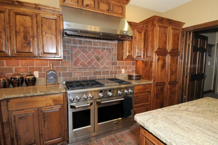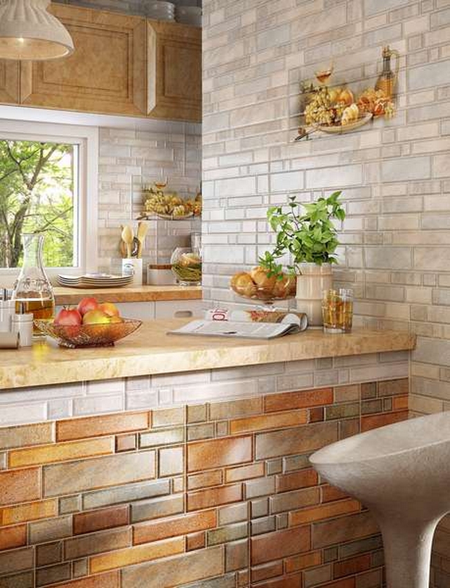 - Имитация на зидария. Обикновено тази опция се използва в кухни в стила на френската страна. Характеризира се с използването на материали с различни размери и форми.