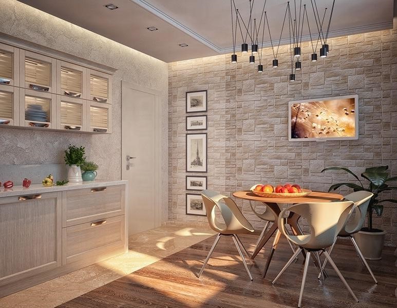 - Имитация на камък. Също така добър за интериор в стил кънтри.Добре върви с мебелите от естествено дърво.