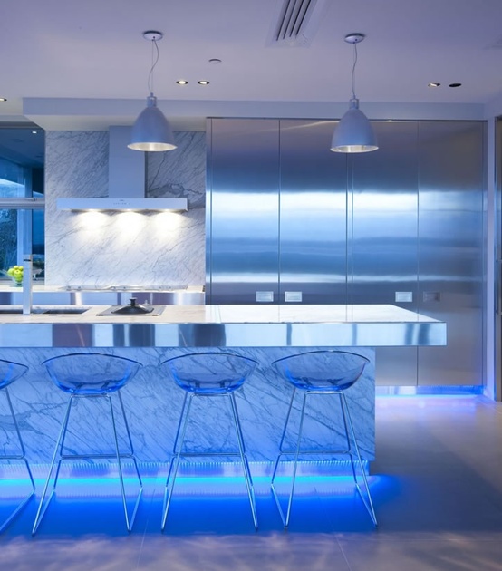 Разбира се, на първо място, обмисляйки кой интериор LED подсветката ще се впише най-добре, идват примери за интериори в модерни стилове. Такова осветление винаги ще изглежда органично в кухнята в стила на хай-тек, минимализъм, модернизъм. Във всички тези стилове се оценяват простотата на формите, геометричността, прости и ясни линии в мебелите, съвременните технологии, технологичните иновации, материалите - пластмаса, метал, желязо, хромирани детайли и футуристичен вид на всички елементи. Разбира се, при цялото това разнообразие от иновации в дизайна, светодиодите ще бъдат повече от всякога полезни. Въвеждайки такова осветление в модерен интериор, не можете да се притеснявате за съвместимост и да изберете специално място.