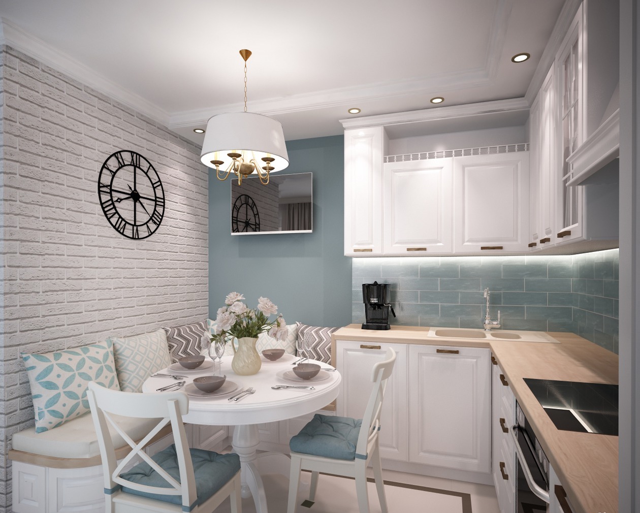 - Покритието на всяка зона поотделно в малка кухня е особено актуално. Разделяйки пространството, светлината визуално го уголемява и прави стаята по-просторна.