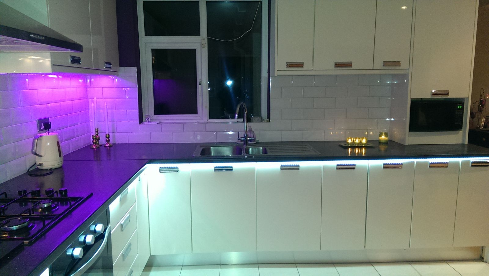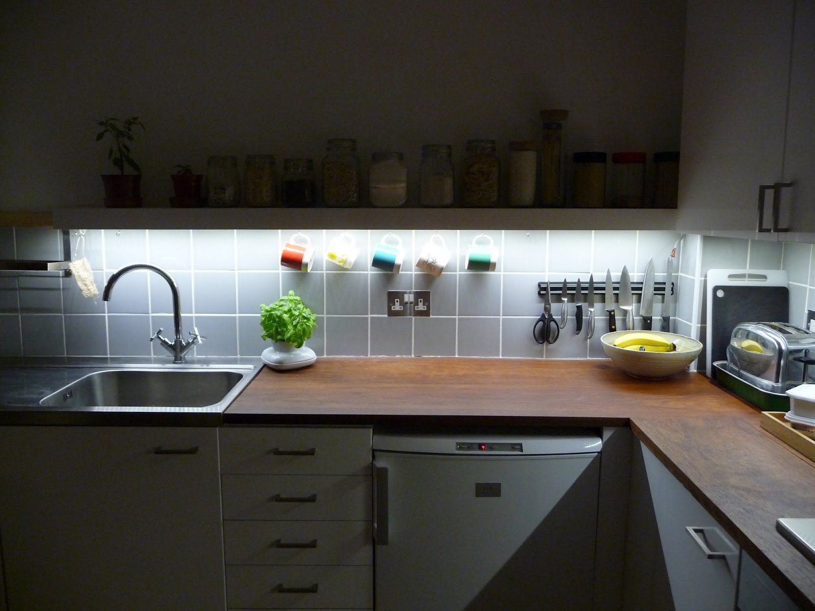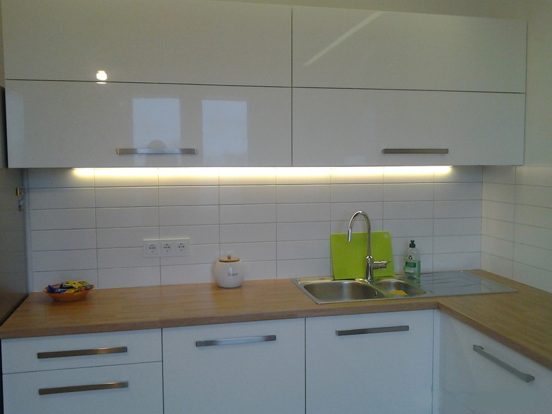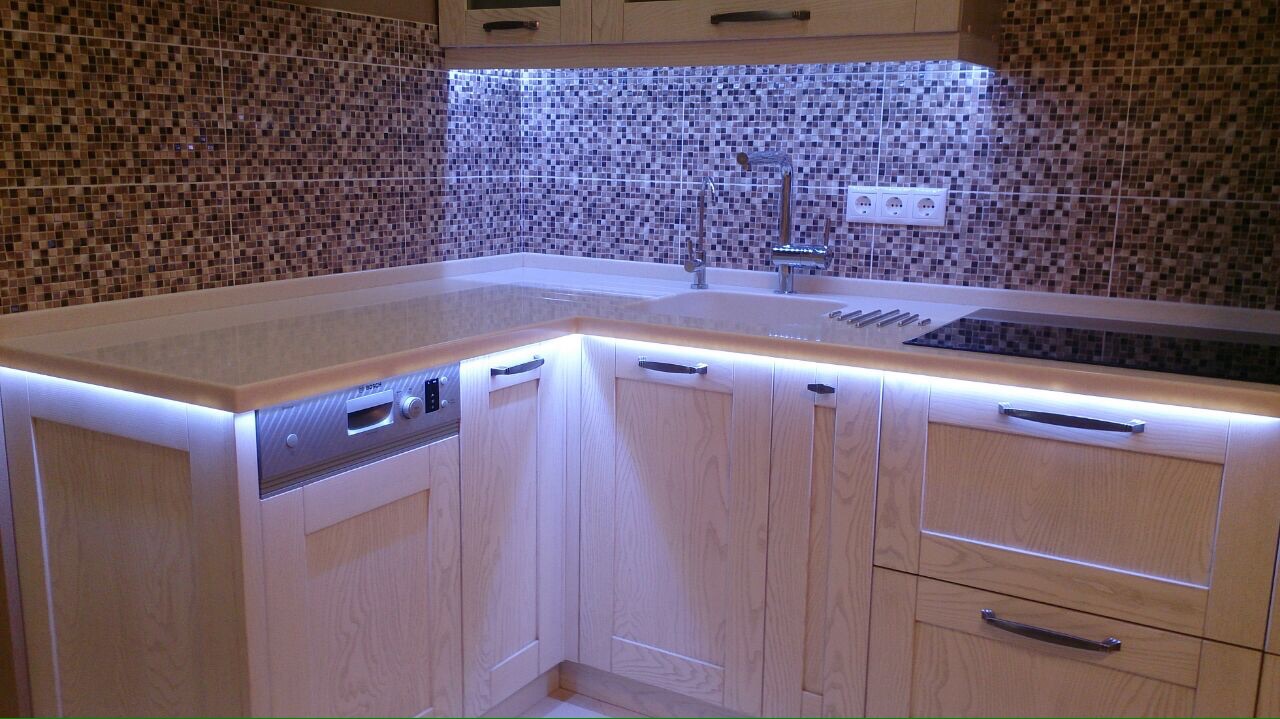 LED лентата в кухнята под шкафовете е най-добрият начин за инсталиране, защото когато поставите източник на светлина в долната част на шкафа, сянката няма да падне от плота или от човека.