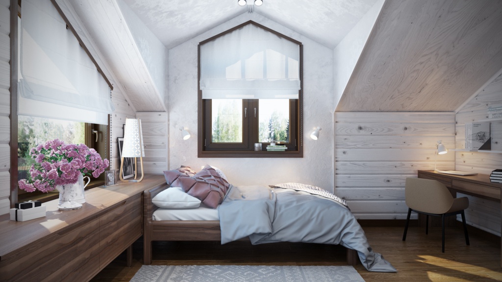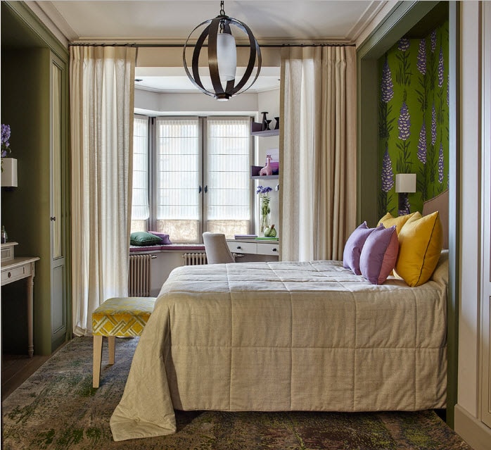 Cette conception de la chambre convient à un adulte qui a certaines perspectives sur la vie. La couchette est équipée d'une verrière articulée de textiles minces, blanc comme neige.
