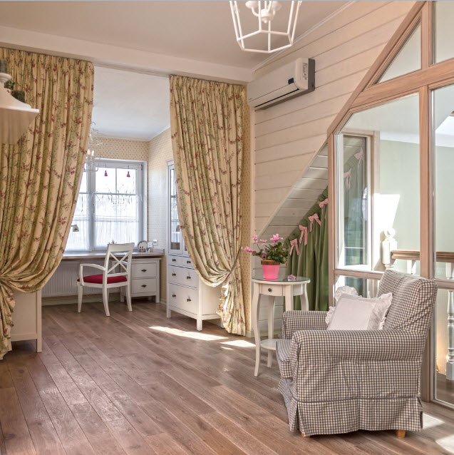 De plus, les locaux provençaux peuvent être accentués par plusieurs zones. Sans aucun doute, ce sera un endroit pour dormir et un endroit pour étudier. L'espace doit être bien éclairé, il vaut donc la peine d'envisager d'installer plusieurs luminaires, dont l'un pèse sur le lit.