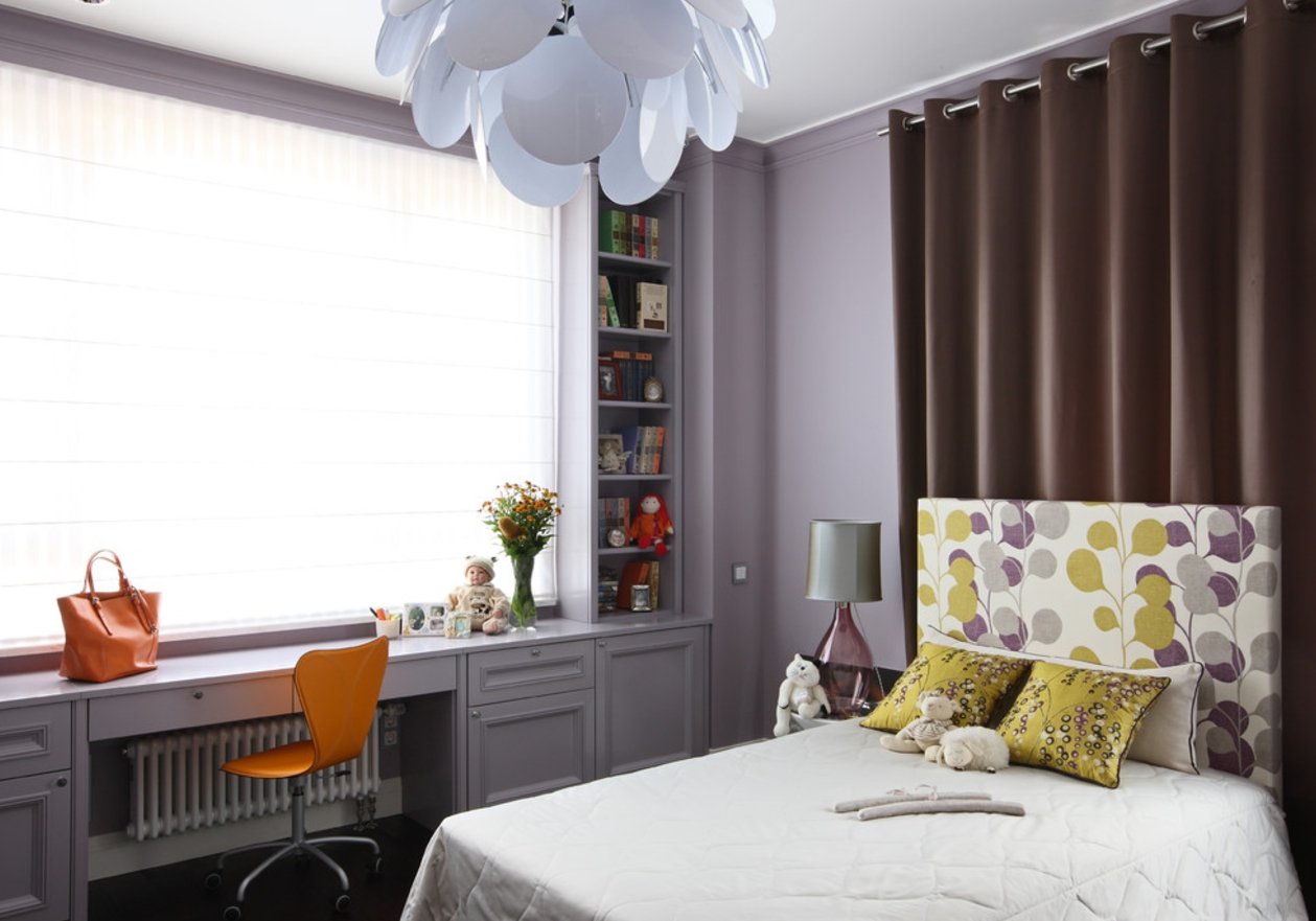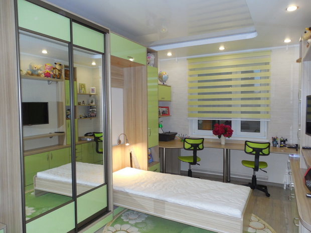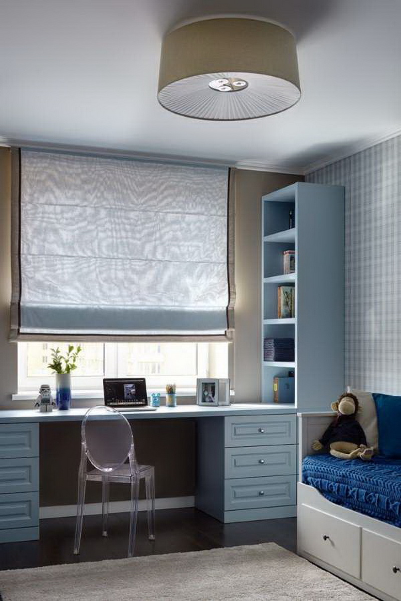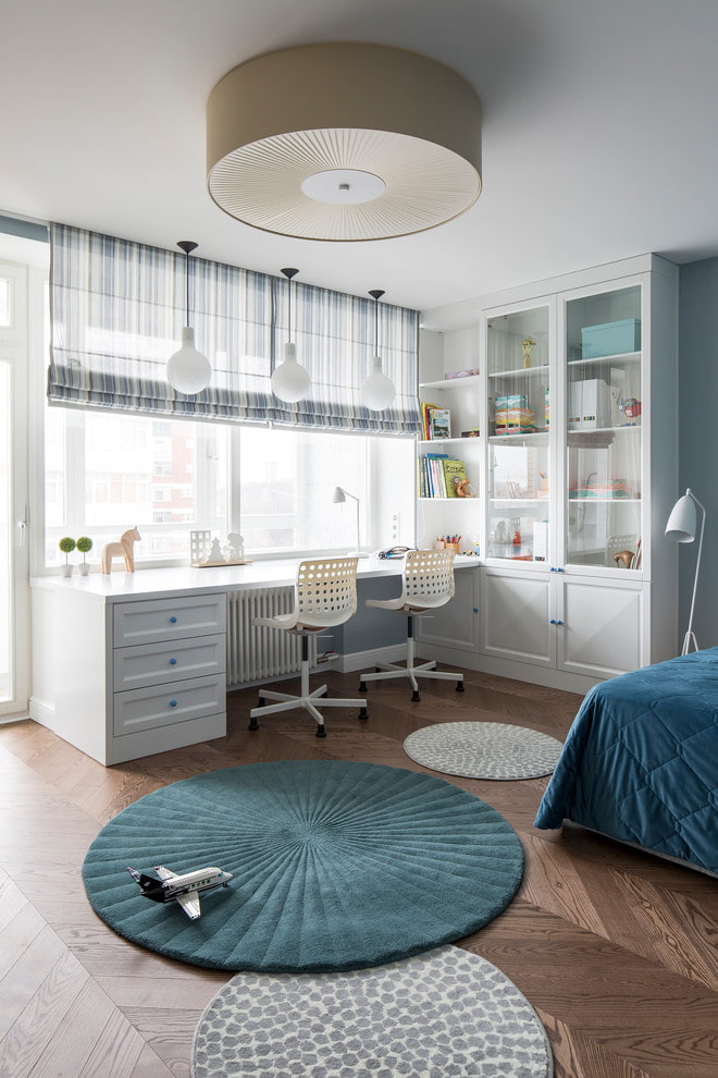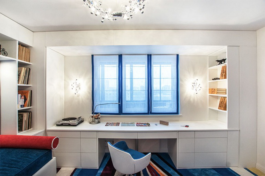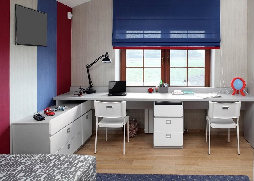 Le long comptoir est très impressionnant, placé le long de la fenêtre avec des tiroirs intégrés, complété par les coins des armoires d'origine pour ranger les livres, les fournitures pour les étudiants et autres choses. Cette option est particulièrement pratique si deux enfants vivent dans la pièce. Le design est assez spacieux, implique beaucoup de lumière naturelle et vous permet également de créer un espace séparé pour chaque enfant.