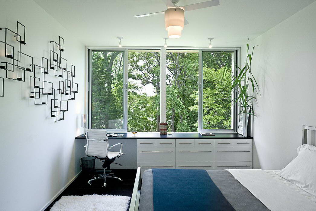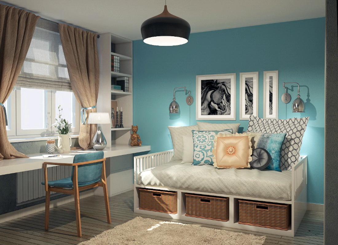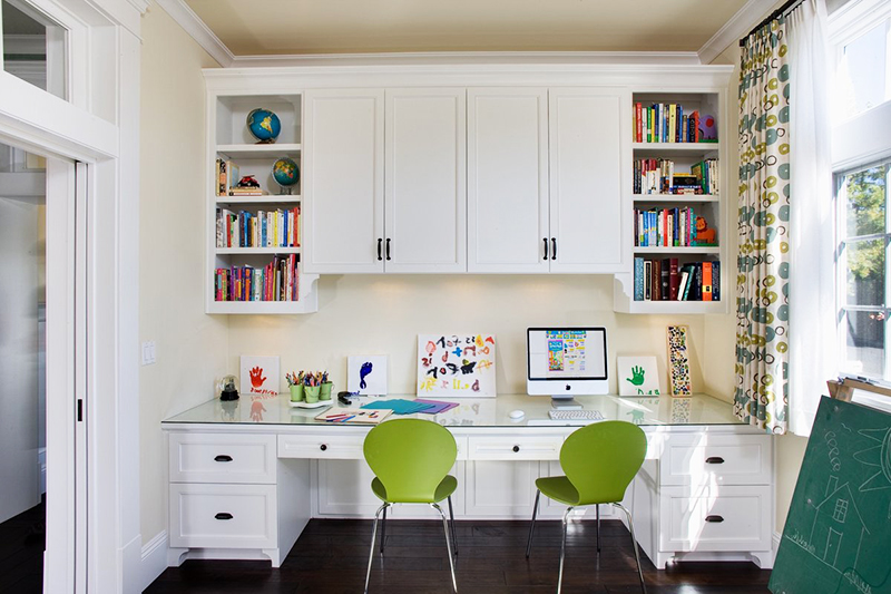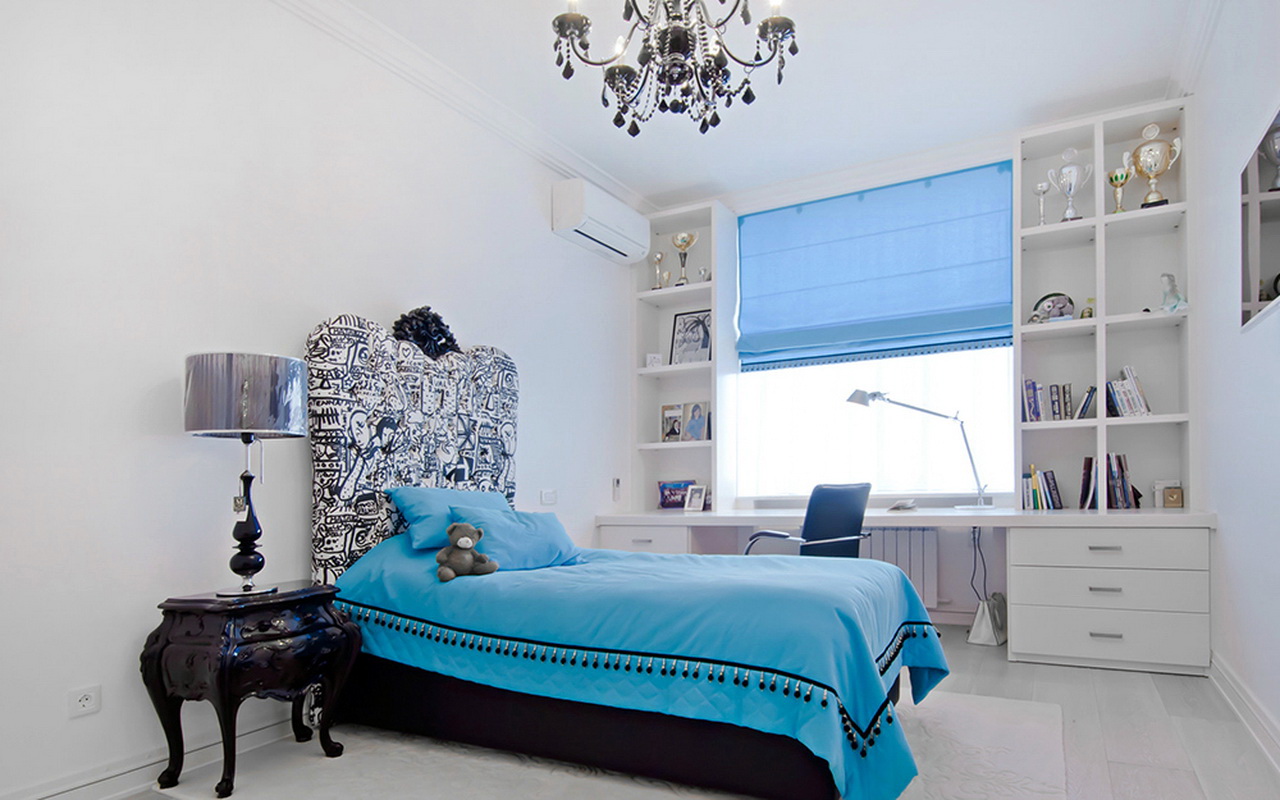 Le long comptoir est très impressionnant, placé le long de la fenêtre avec des tiroirs intégrés, complété par les coins des armoires d'origine pour ranger les livres, les fournitures pour les étudiants et autres choses. Cette option est particulièrement pratique si deux enfants vivent dans la pièce. Le design est assez spacieux, implique beaucoup de lumière naturelle et vous permet également de créer un espace séparé pour chaque enfant.