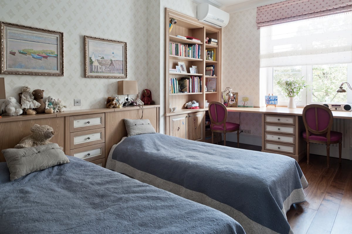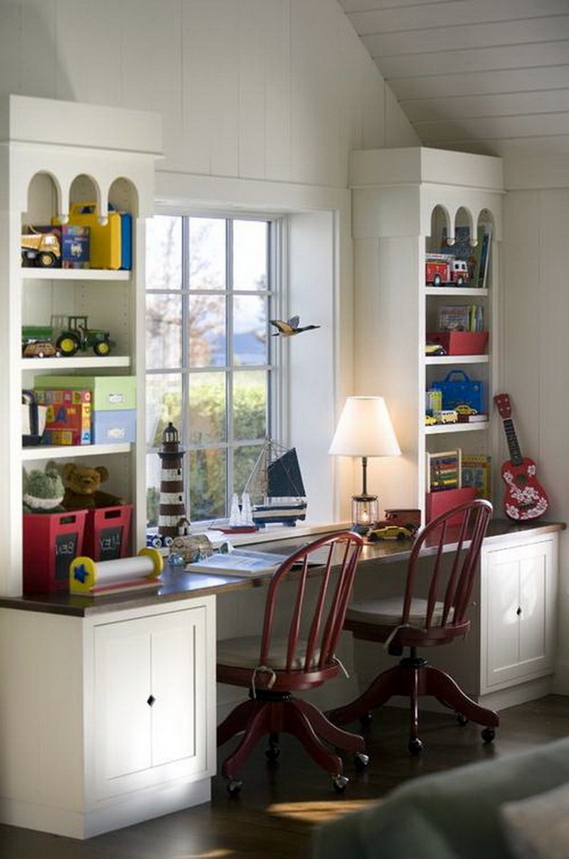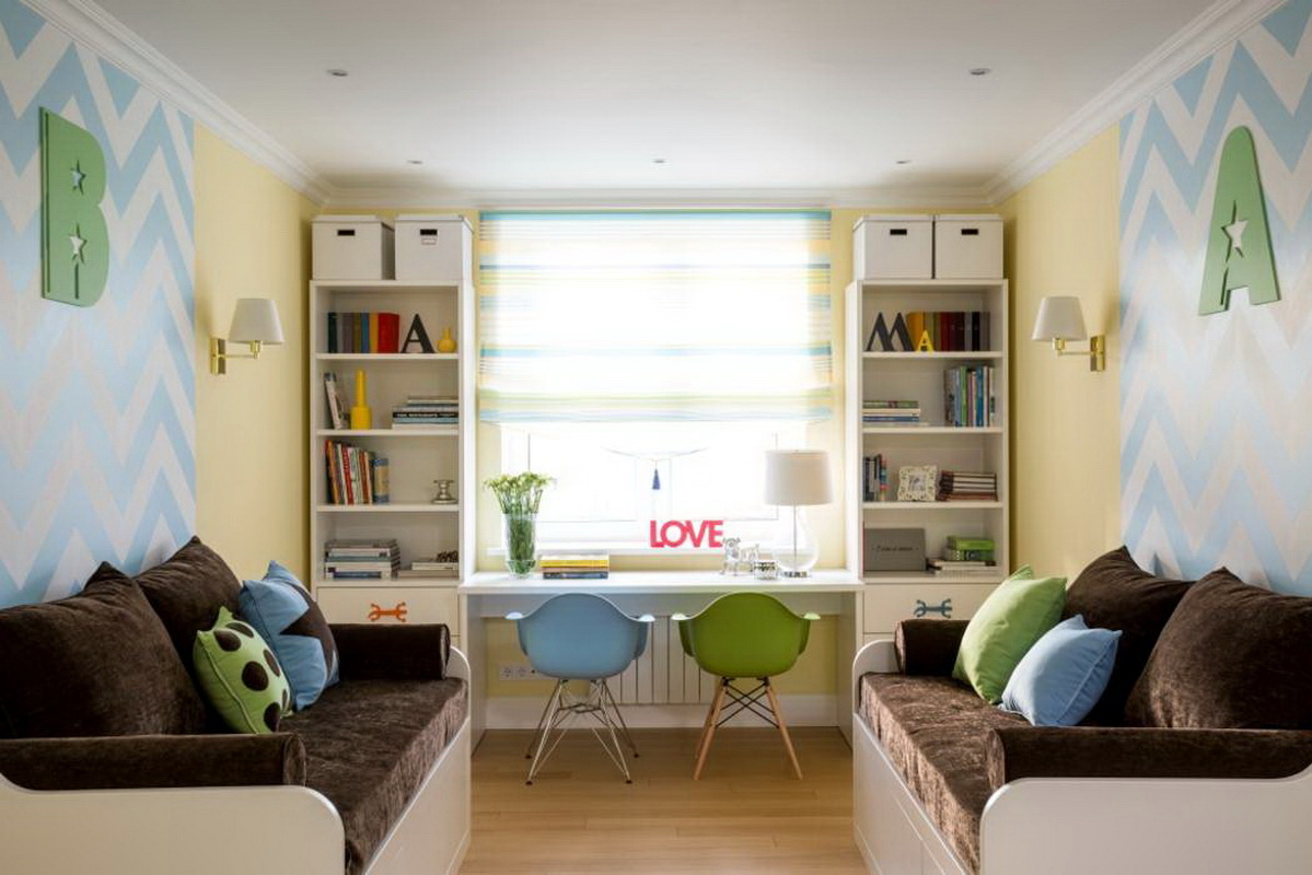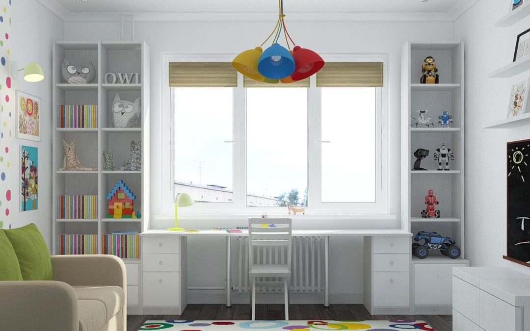 L'endroit près de la fenêtre est idéal pour organiser un espace de travail pour deux enfants vivant dans la même pièce