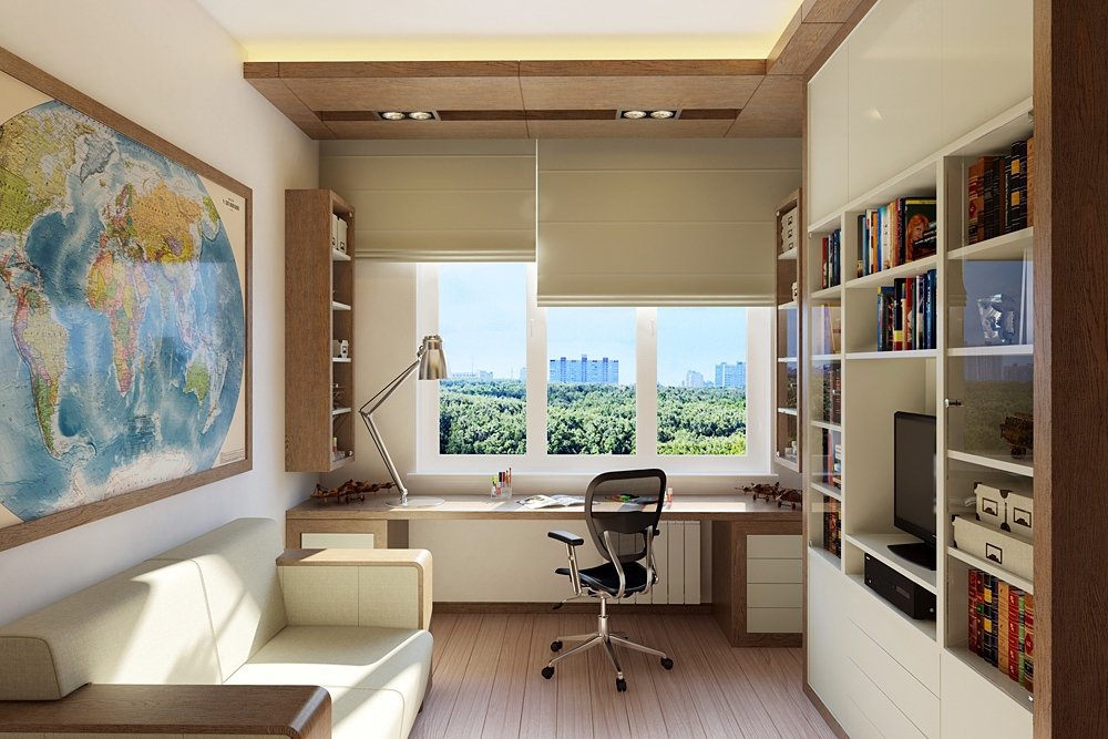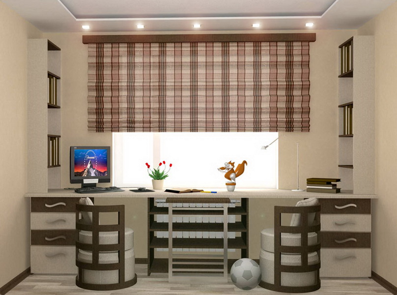 Pour les adolescents, une table d'ordinateur près de la fenêtre deviendra une solution rationnelle, sur laquelle un équipement supplémentaire, par exemple une imprimante, peut être placé sans problème, et en même temps il reste une surface de travail suffisamment libre, si nécessaire pour l'activité des étudiants. La table est complétée par un panneau coulissant pour le clavier, qui économisera de l'espace libre sur la surface de travail. Si nécessaire, vous pouvez faire un petit support pour le moniteur, ce qui vous permet également de ne pas encombrer le comptoir. Les moniteurs modernes, si nécessaire, sont montés même sur le mur.