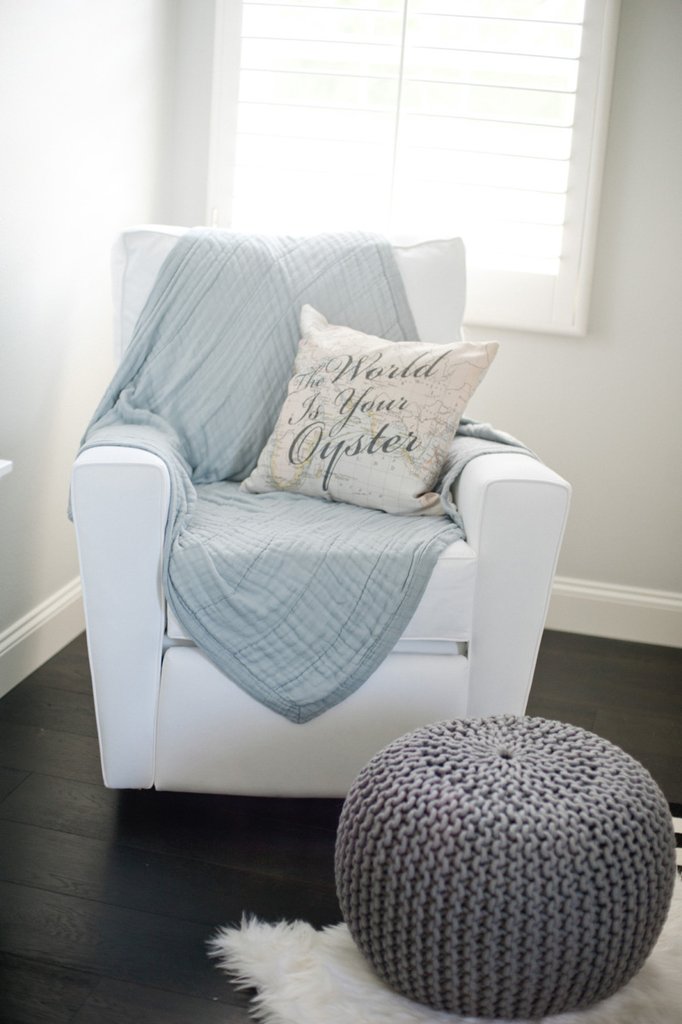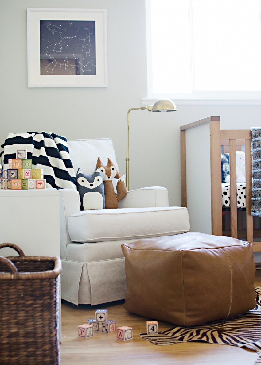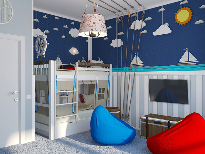 - Un exemple de conception d'une pépinière dans un style marin à l'aide de poufs.