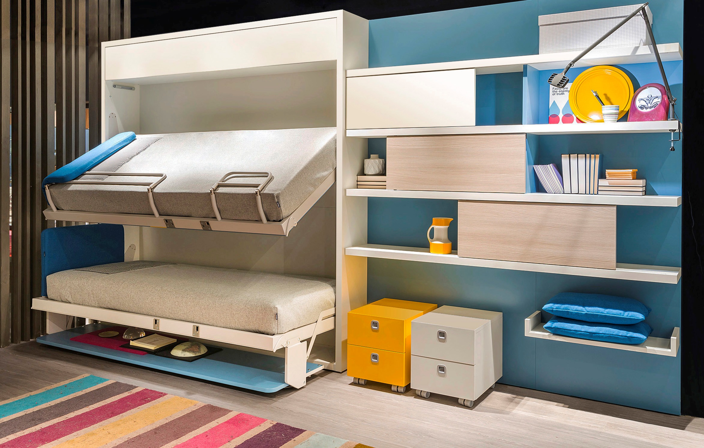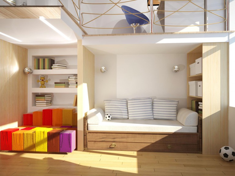 | 4. Boîtes pour les choses | Placard intégré, complexe compact pour enfants avec un lit mansardé sur le placard, des niches coulissantes, un tiroir sous le siège pliant. |