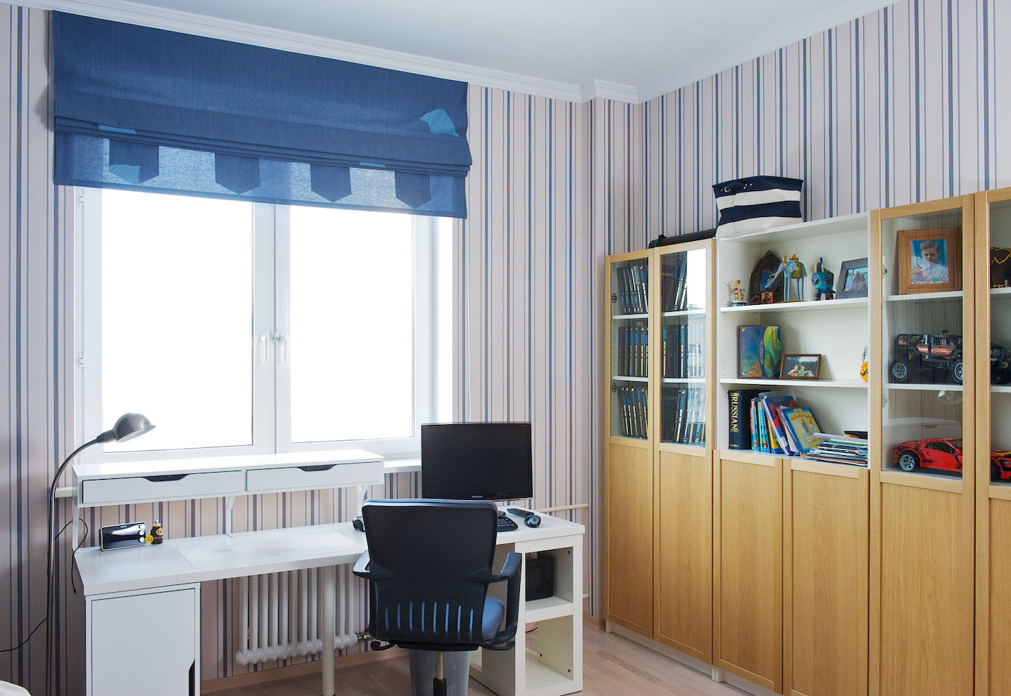 Dans une pièce avec des fenêtres au sud, le papier peint peut être peint dans toutes les nuances, en particulier dans les tons bleu, gris clair et violet.