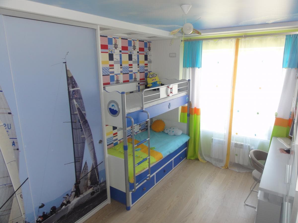 À l'intérieur d'une chambre d'enfant pour deux garçons, tout doit correspondre à la perception de l'âge. Même s'il s'agit d'un style marin, le canapé «Ship» convient au bébé et le fils aîné appréciera le décor sur le thème des pirates. Mais vous pouvez tout organiser comme une cabine pour un jeune homme ou une cabine - avec une vraie barre, un marché, une boussole, une carte des routes maritimes et un lit superposé. Le thème "Underwater Brothers" et "Finding Nemo" avec des autocollants des personnages principaux des dessins animés conviendra à deux jumeaux ou à un âge scolaire plus avancé.