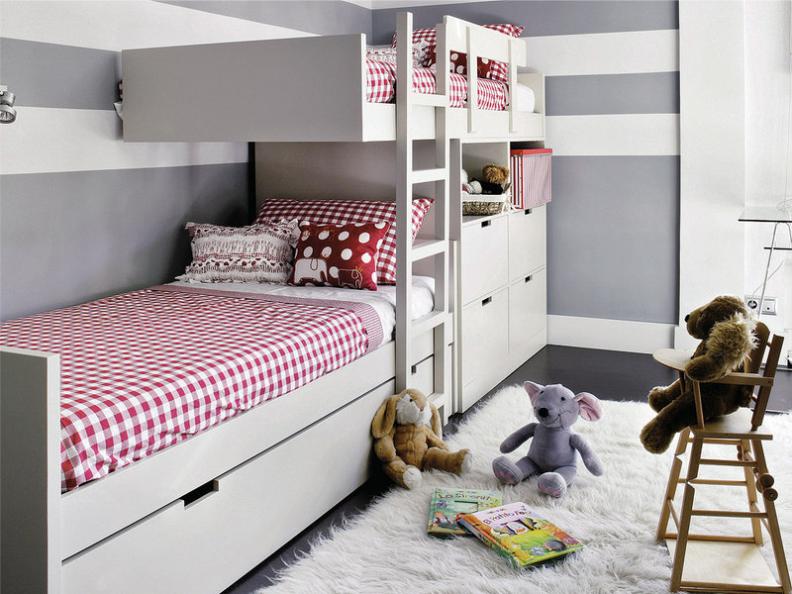 Pendant la réparation, il est également important de considérer où les boîtes de rangement seront situées - tiroirs, armoires, étagères et mezzanines. Pour eux, il y a une place dans la petite chambre "Khrouchtchev" et une chambre spacieuse dans une maison privée. S'il y a très peu d'espace, il est préférable de déplacer les armoires dans une autre pièce afin qu'il y ait plus d'espace pour que deux fidèles puissent jouer.
