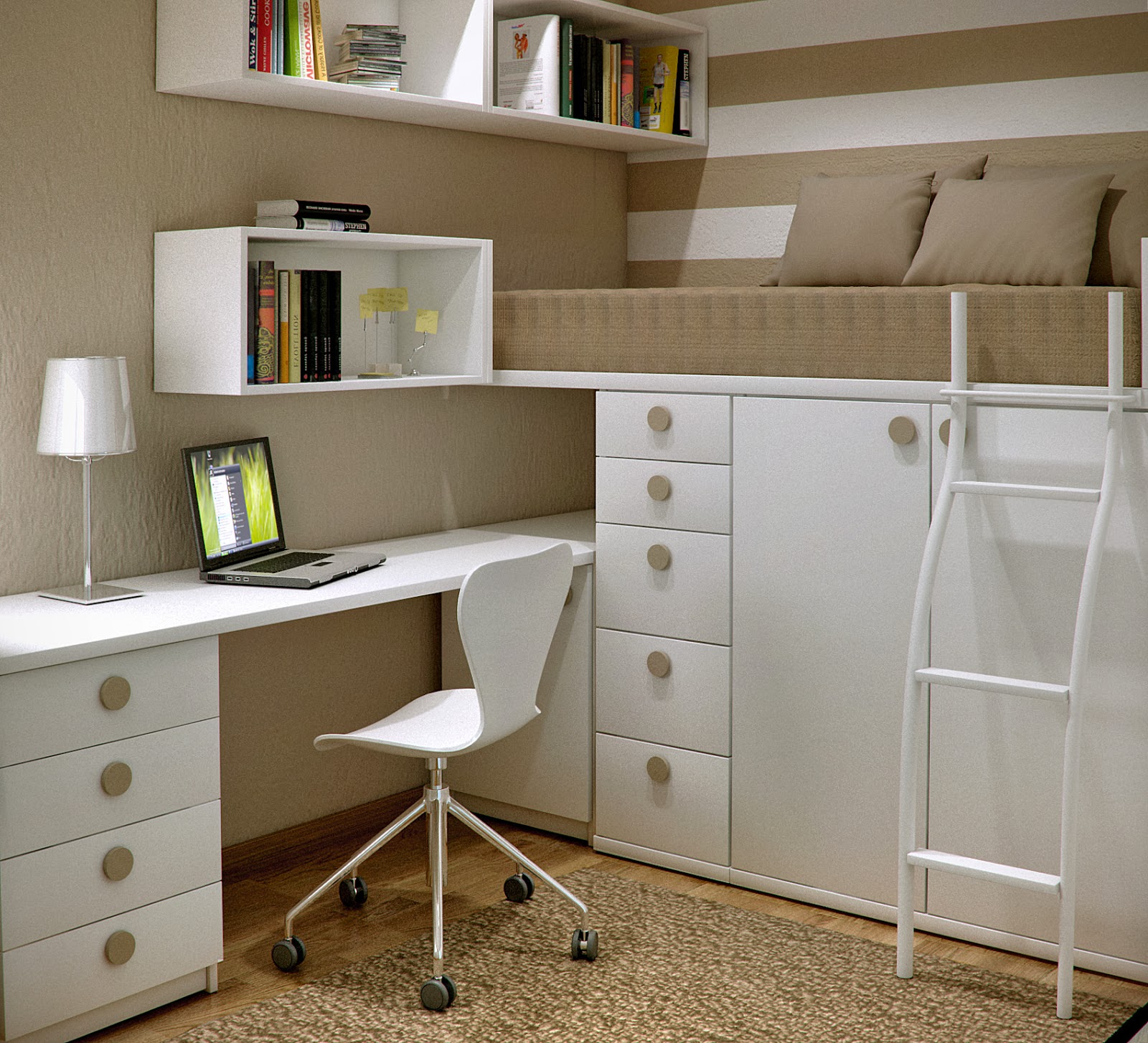 - aménager une zone de couchage sur un mur et une zone de travail à l'opposé;