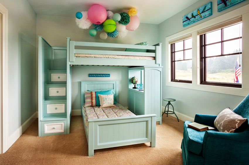 Si des sœurs ou des frères vivent dans la chambre, alors un lit superposé est indispensable. Cette option convient si frère et sœur vivent ensemble.En règle générale, le niveau supérieur est attribué à l'enfant plus âgé, car il est plus dangereux.