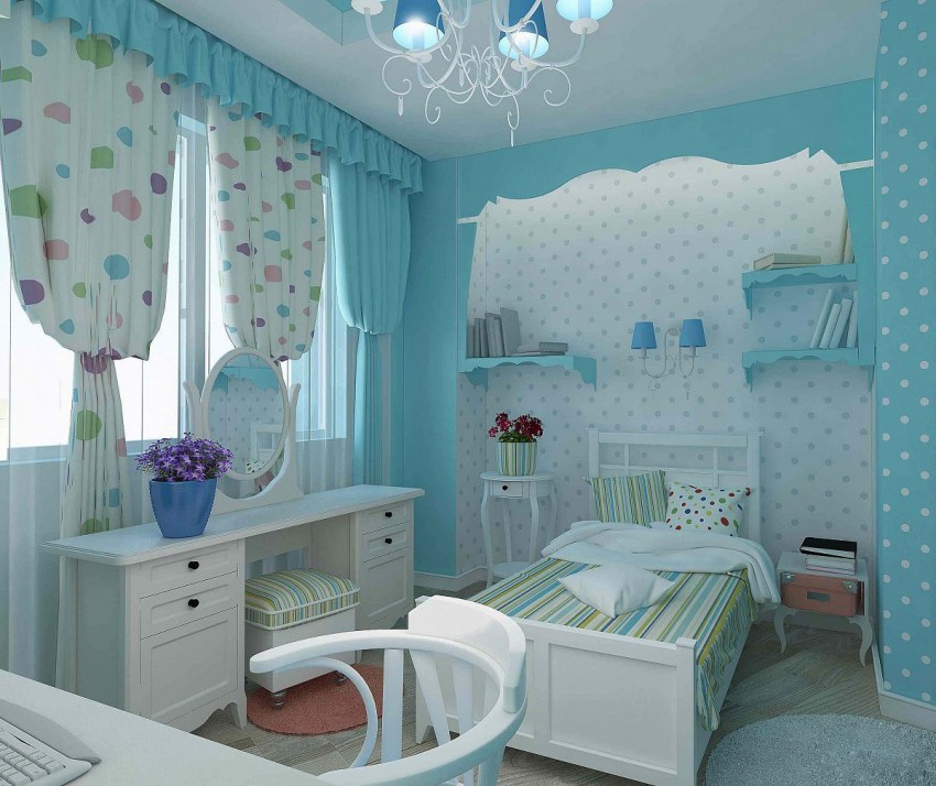 Un bon choix est d'utiliser une palette de couleurs dans le style du lit, en raison de ses caractéristiques qui rendent la pièce visuellement plus grande, et également en raison de l'influence spirituelle positive sur l'enfant. Pour une fille, il sera pertinent d'utiliser une couleur rose tendre ou pêche.