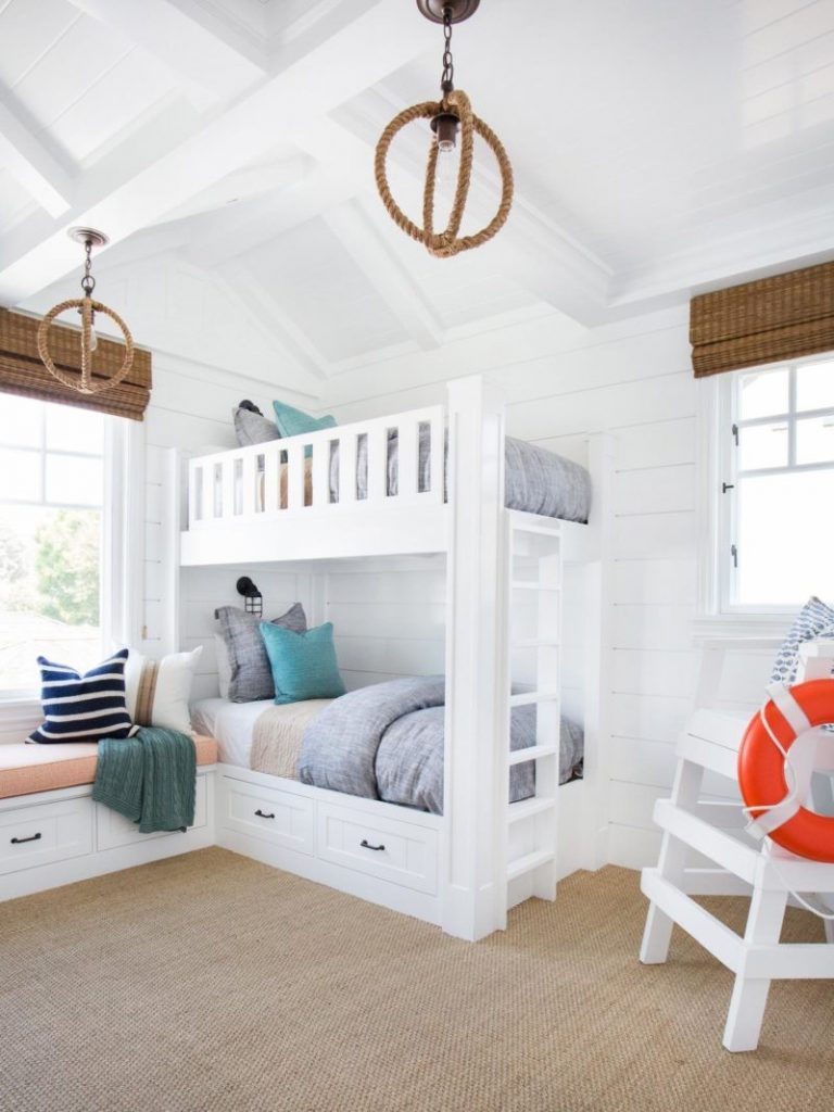 Lit superposé blanc dans une pièce très lumineuse pour deux filles