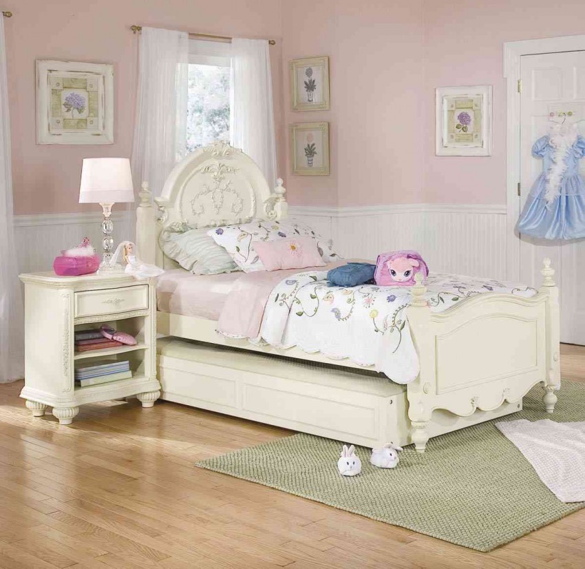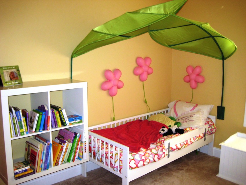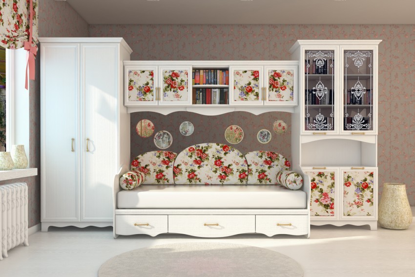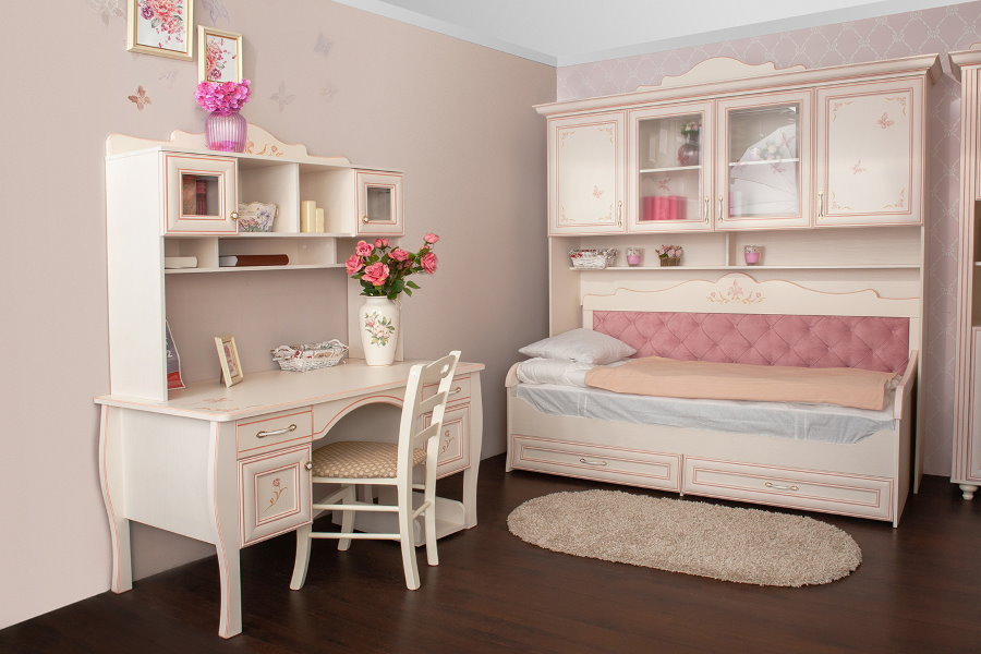 - Si vous regardez la photo de la chambre des enfants avec des meubles blancs où vivent les filles, alors des objets légers, des accessoires délicats et du tulle léger y sont souvent utilisés. Les nuances roses dominent.