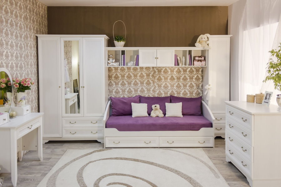 - Pour les enfants hétérosexuels, il est habituel de délimiter les zones dans des tons séparés. Une palette neutre avec une dominance de ton clair est rarement utilisée. Si la zone pour les garçons peut être mise en évidence avec des couleurs brunes ou grises, alors pour les filles, les tons orange ou lilas conviennent.