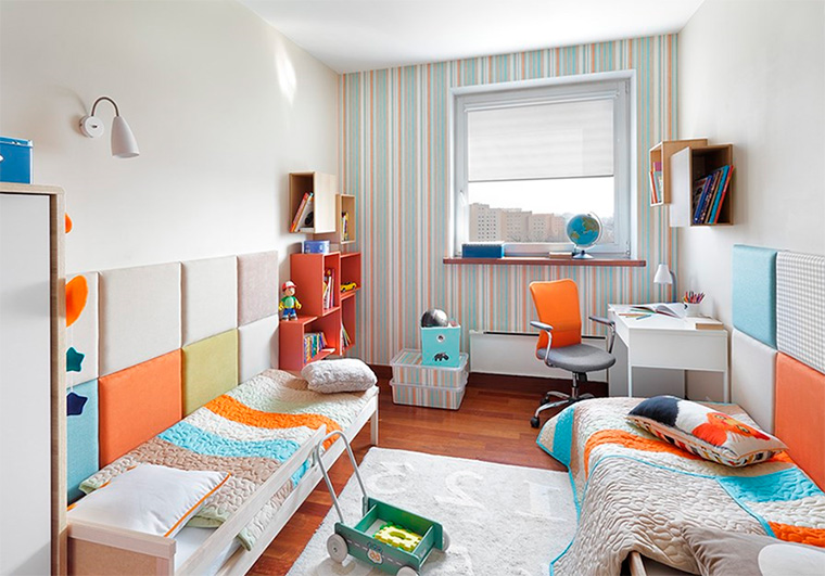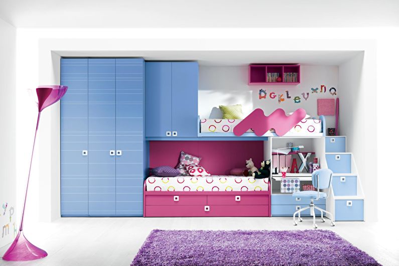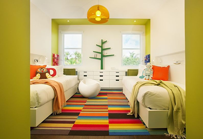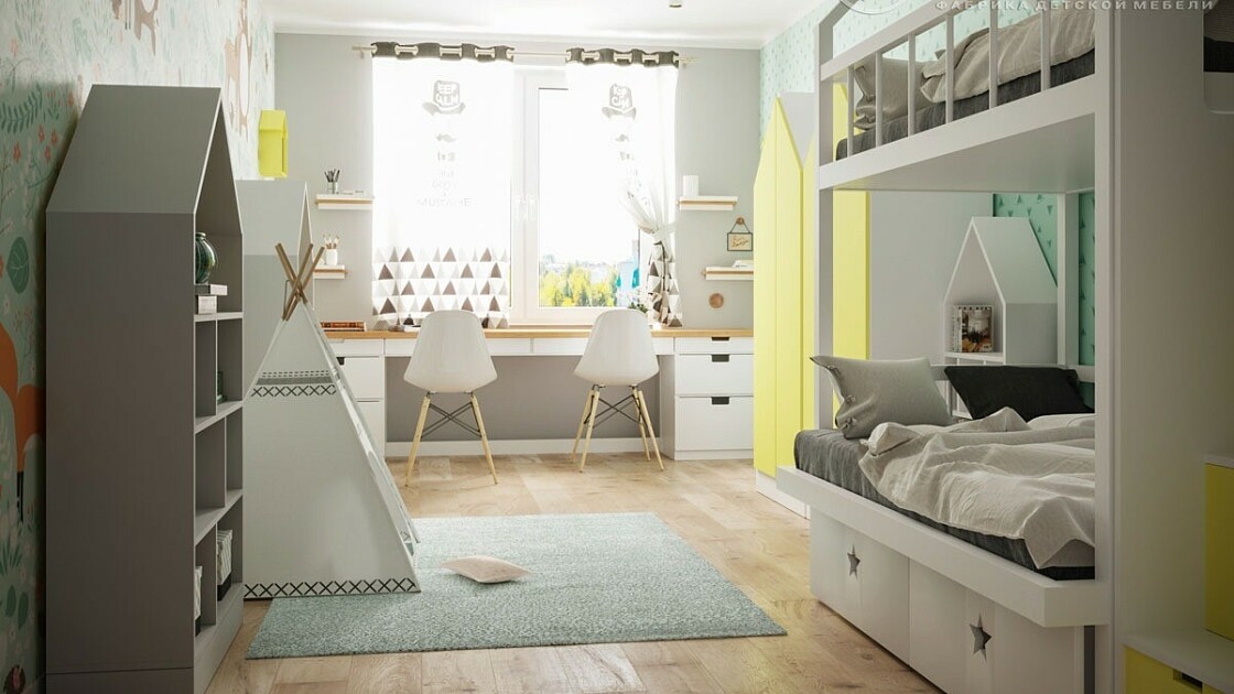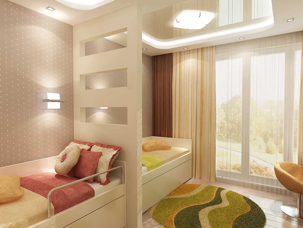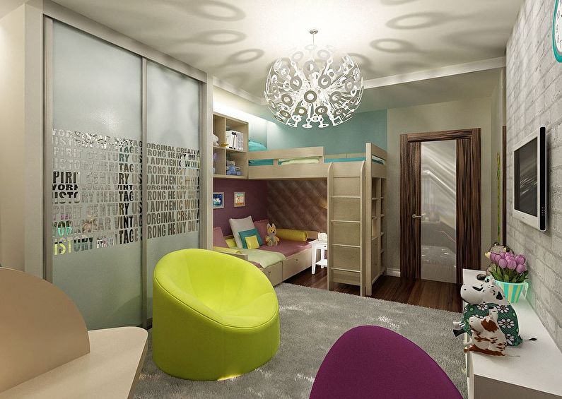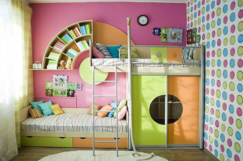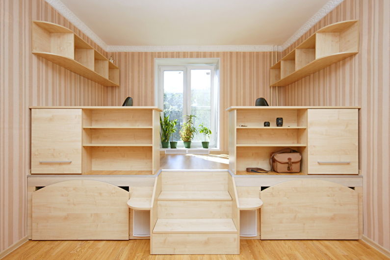Si l'appartement est petit, les familles avec deux enfants équipent dans la plupart des cas une pièce. Un point important dans ce cas est l'acquisition de meubles compacts et fonctionnels. Il ne prendra pas beaucoup de place, mais il est utilisé par deux enfants. Chaque enfant a besoin d'une zone distincte pour ne pas ressentir d'inconfort et, si nécessaire, être dans son propre espace.