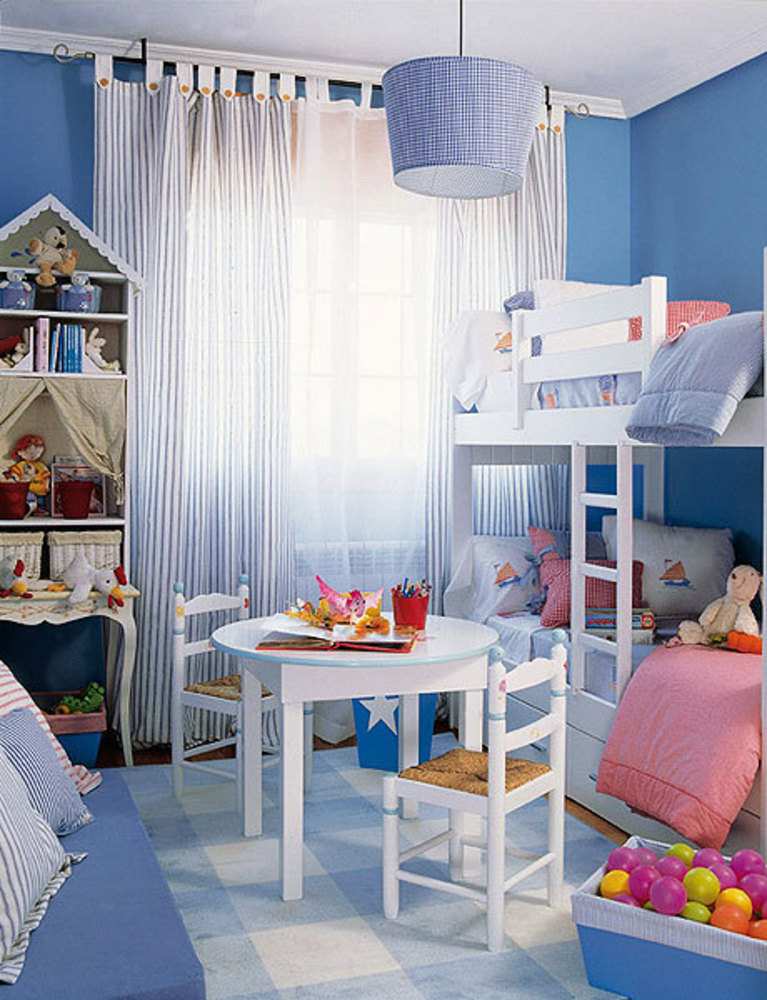 L'aménagement de la chambre, dans laquelle deux enfants différents cohabiteront, requiert une attention particulière. Le choix de la couleur peut être une question litigieuse, mais un compromis peut toujours être trouvé. Pour que les enfants ne se sentent pas blessés, faites différents accents de matériaux de finition. Des accessoires intérieurs d'origine sont également utilisés.