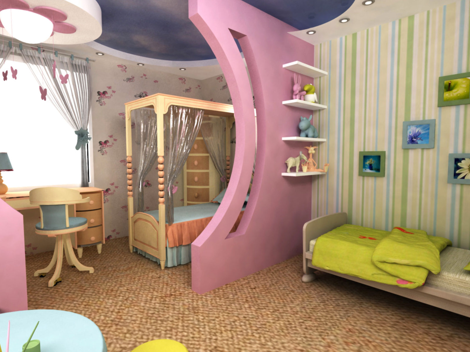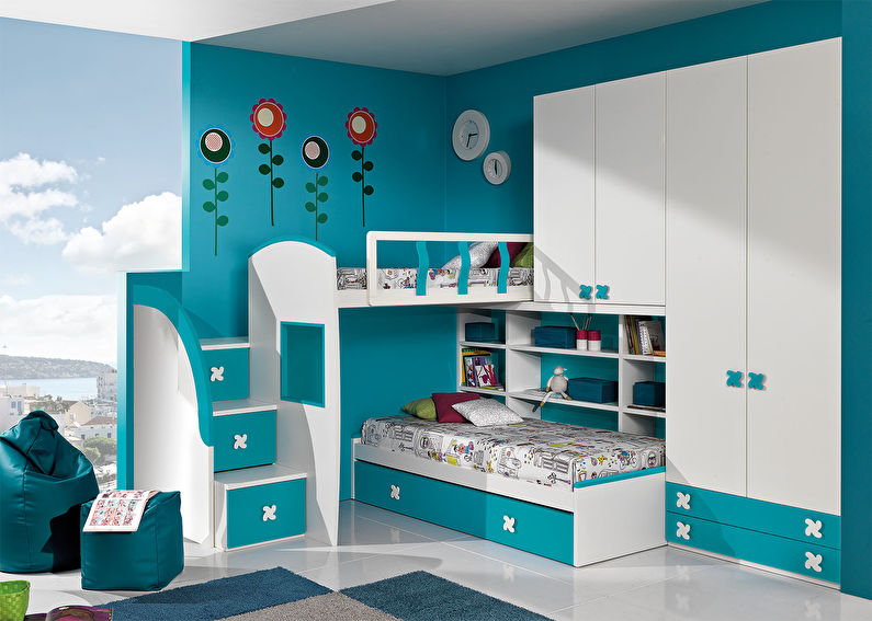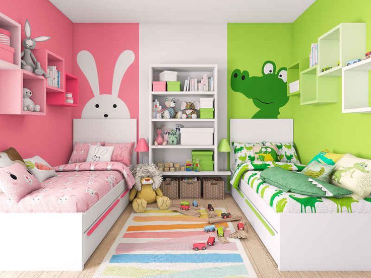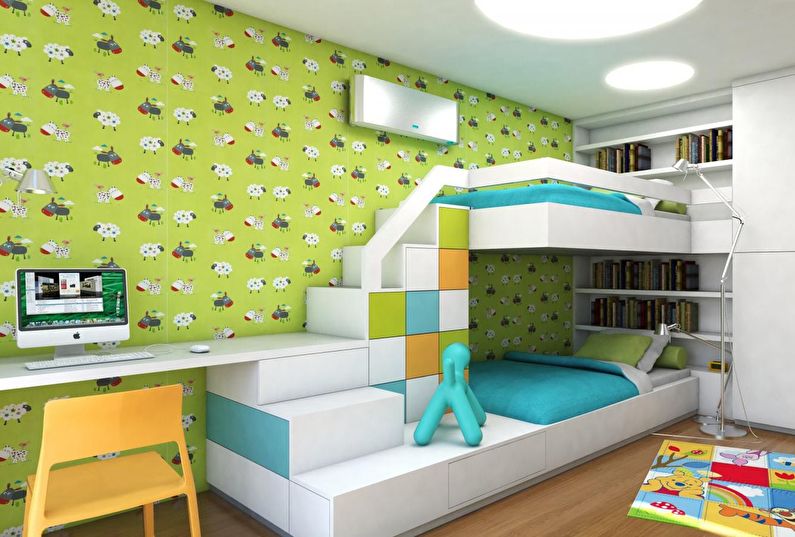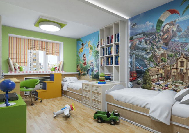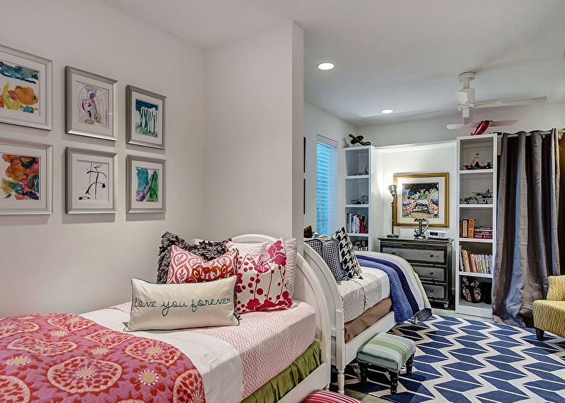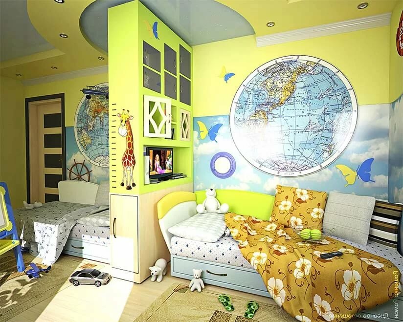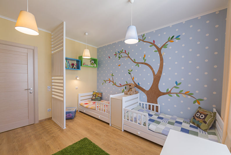 Si la pièce a de petites dimensions, des lits transformateurs conviennent. Économiser également de l'espace aidera la conception à deux niveaux. Il offrira de l'intimité aux enfants. Cependant, il prend peu de place au sol. Si possible, vous pouvez mettre deux lits séparés, créant des zones indépendantes. Pour qu'ils diffèrent les uns des autres et qu'il soit clair à qui appartient la couchette, choisissez des lits de différentes couleurs. Pour les murs, une décoration avec des images de vos personnages préférés est utilisée.