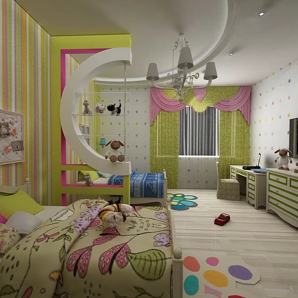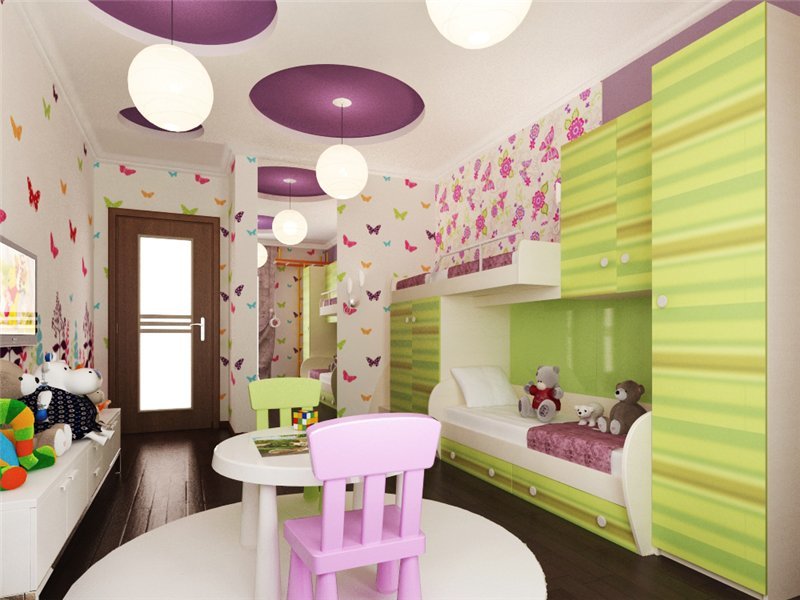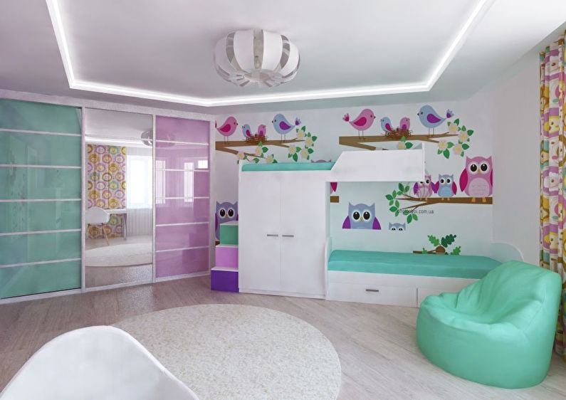 La clé de la décoration de la pièce sera un design bicolore. La combinaison de vert clair avec une teinte sableuse diluera la monotonie, créant une image globale pittoresque. La combinaison du rose et du vert remplira la pièce de fraîcheur, de pureté et d'énergie naturelle. Afin de ne pas irriter le système nerveux des enfants, il convient d'abandonner les couleurs noires, rouges et foncées. Une petite quantité de ces peintures ne nuira pas.