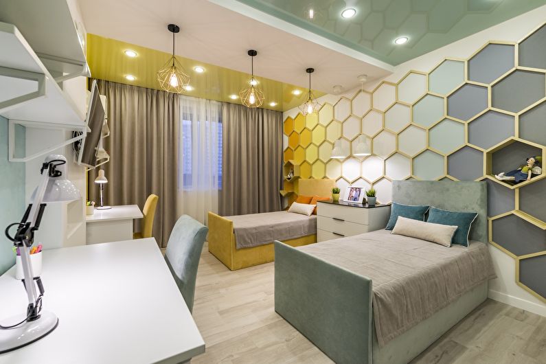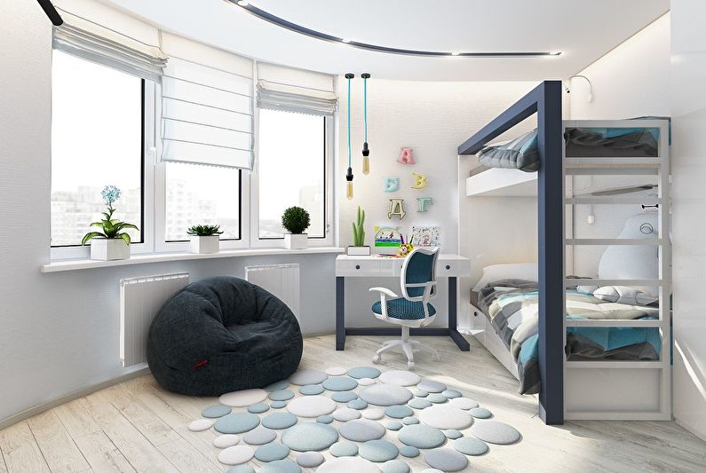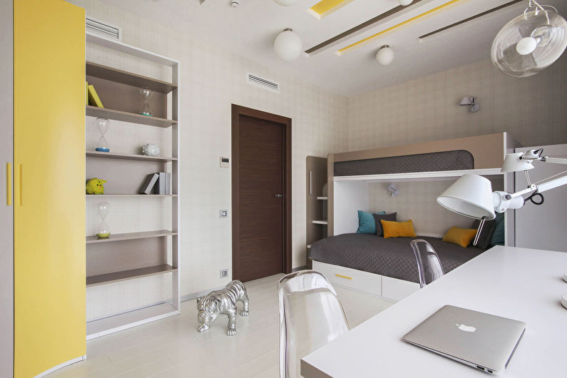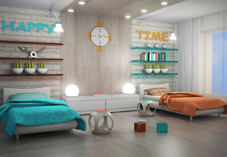 La conception de la chambre des enfants est basée sur la préférence et l'âge de l'enfant. En raison des changements d'attitude progressifs, il vaut la peine de faire de l'intérieur un style moderne. Surtout s'il s'agit d'une crèche pour deux enfants hétérosexuels. Dans ce cas, le mobilier est préférable de choisir des tons neutres fonctionnels et équilibrés. Vous pouvez ajouter des accents lumineux à l'aide d'accessoires d'origine.