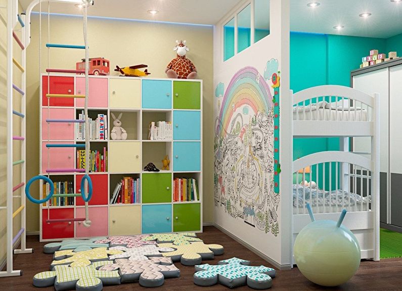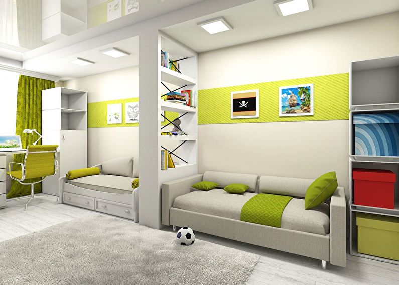La séparation de la zone pour les enfants hétérosexuels est simplement une nécessité. Dans ce cas, différentes partitions, armoires, racks sont utilisés.